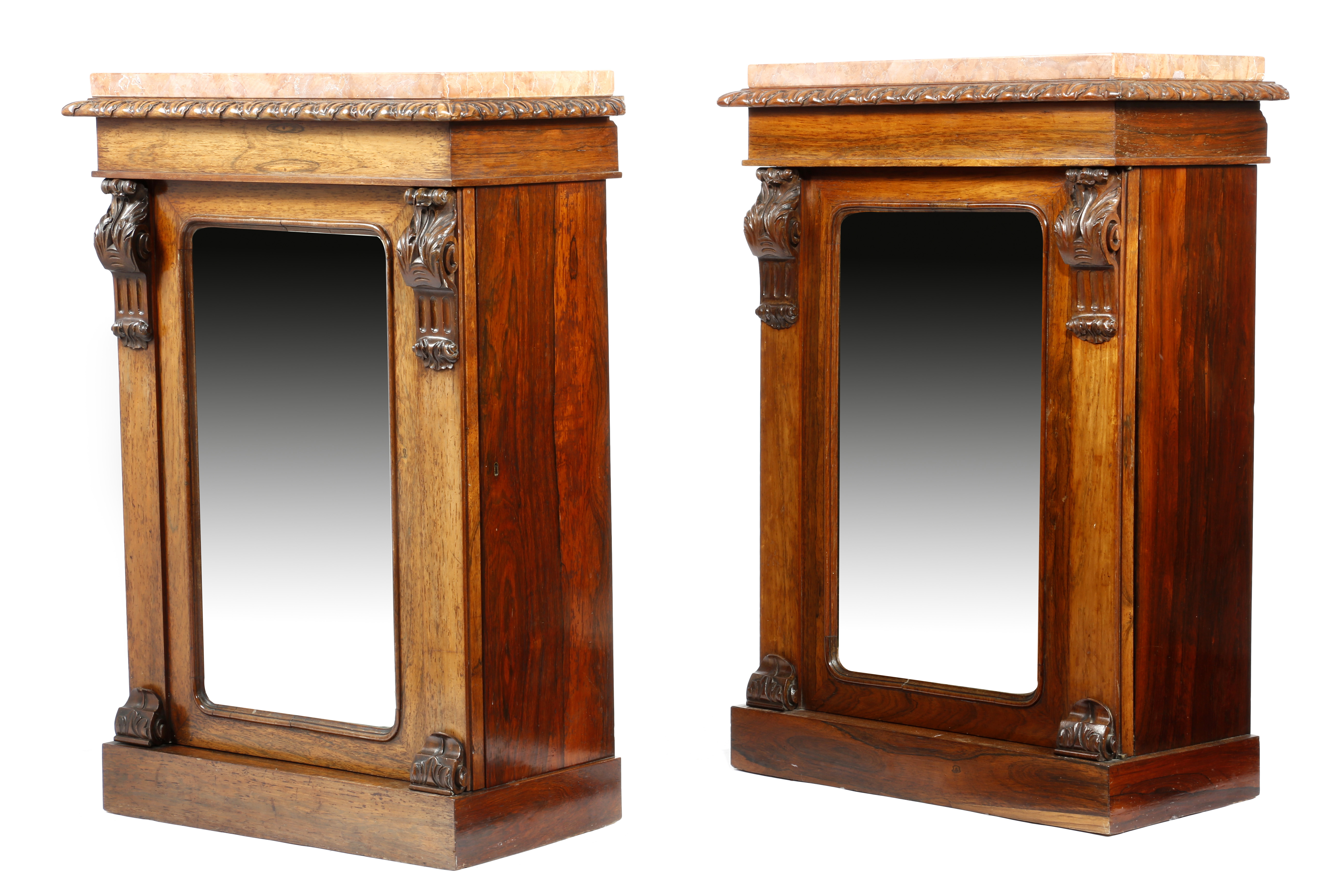 λ A pair of early Victorian rosewood side cabinets by Johnstone & Jeanes, each with a pink breche marble top, above a leaf carved edge and a mirrored door applied with leaf carved corbels, enclosing a shelf, the door stamped 'JOHNSTONE & JEANES NEW BOND ST. LONDON 5405' and '5406', 90.5cm high, 63.8cm wide, 33.5cm deep. (2)