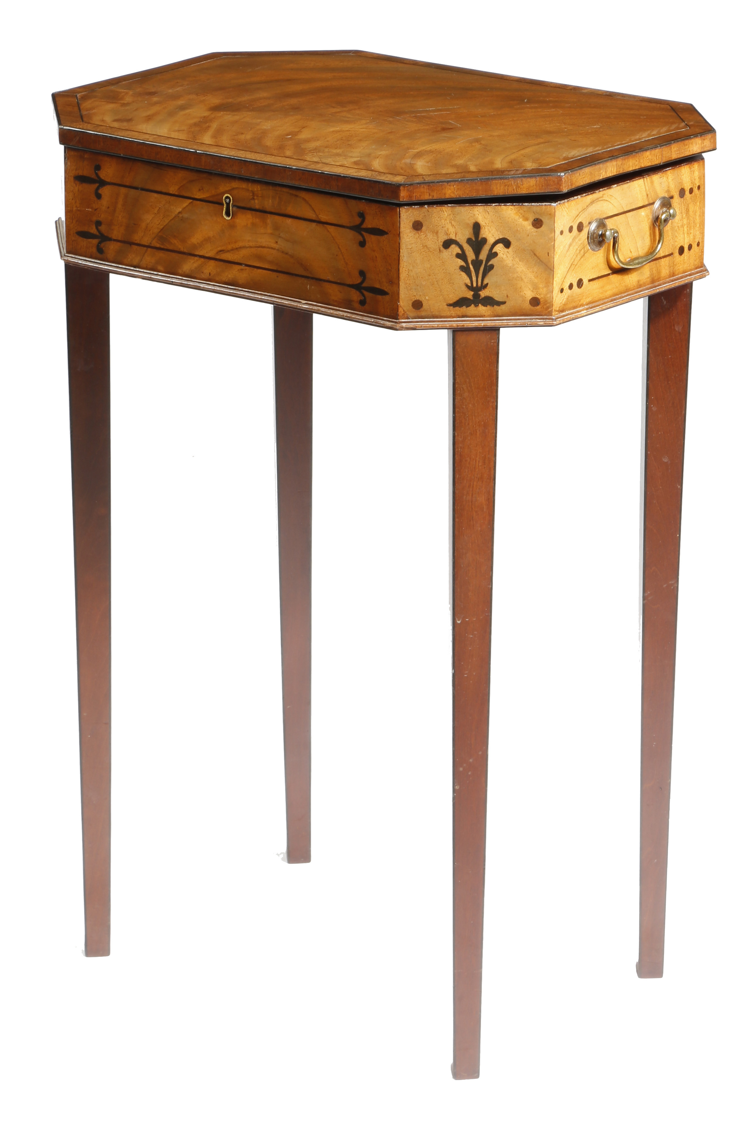 A Regency mahogany sewing table, inlaid with ebonised stringing and marquetry palmettes, the hinged lid revealing two lidded compartments and a trap door access for a bag, on square tapering legs, 72cm high, 51.2cm wide, 36.8cm deep.