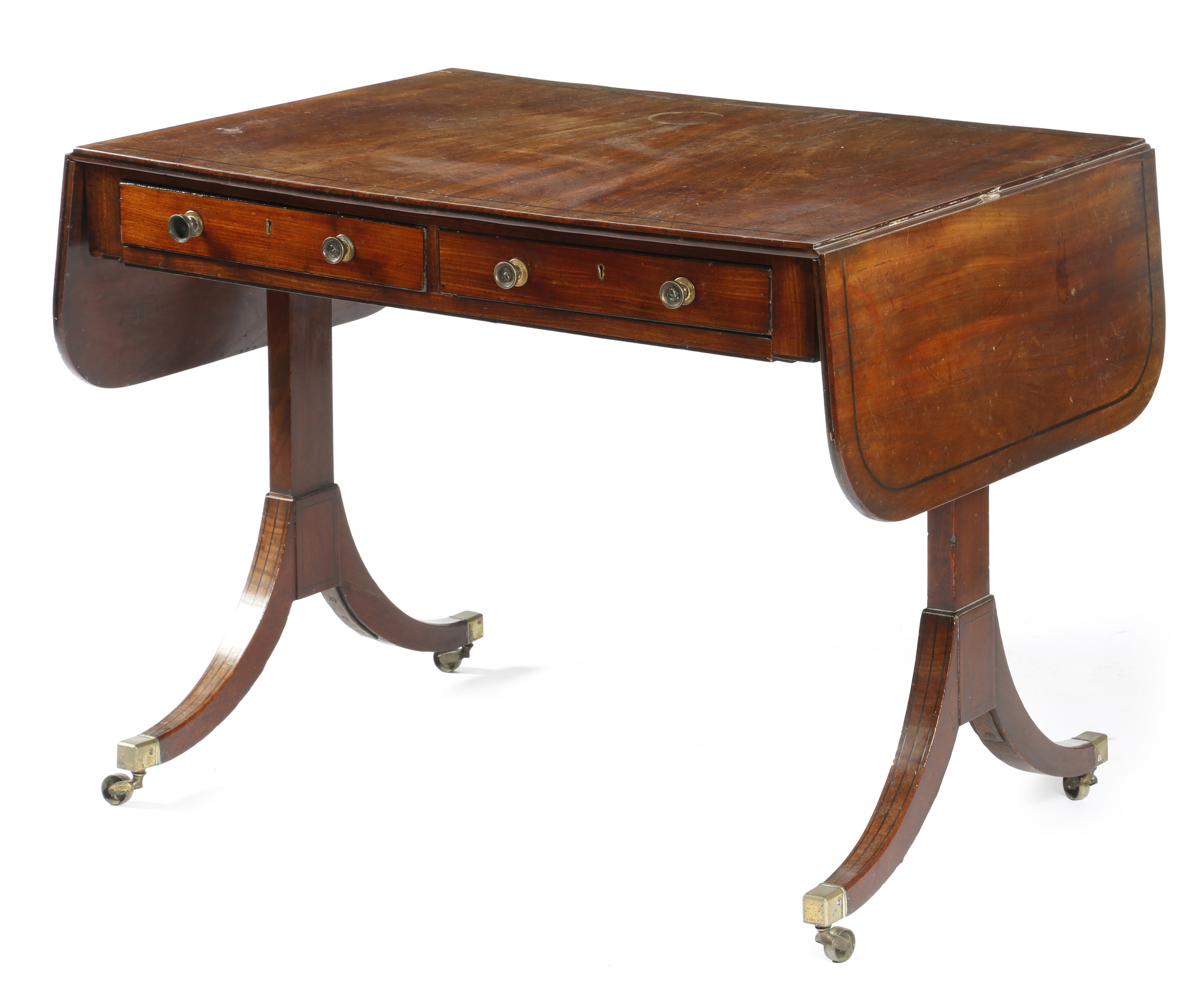 A Regency mahogany sofa table, inlaid with ebonised stringing, the drop-leaf top above a pair of cedar lined frieze drawers, with a high stretcher on trestle ends and scroll legs, with brass caps and castors, 72cm high, 65.5 x 144.1cm.