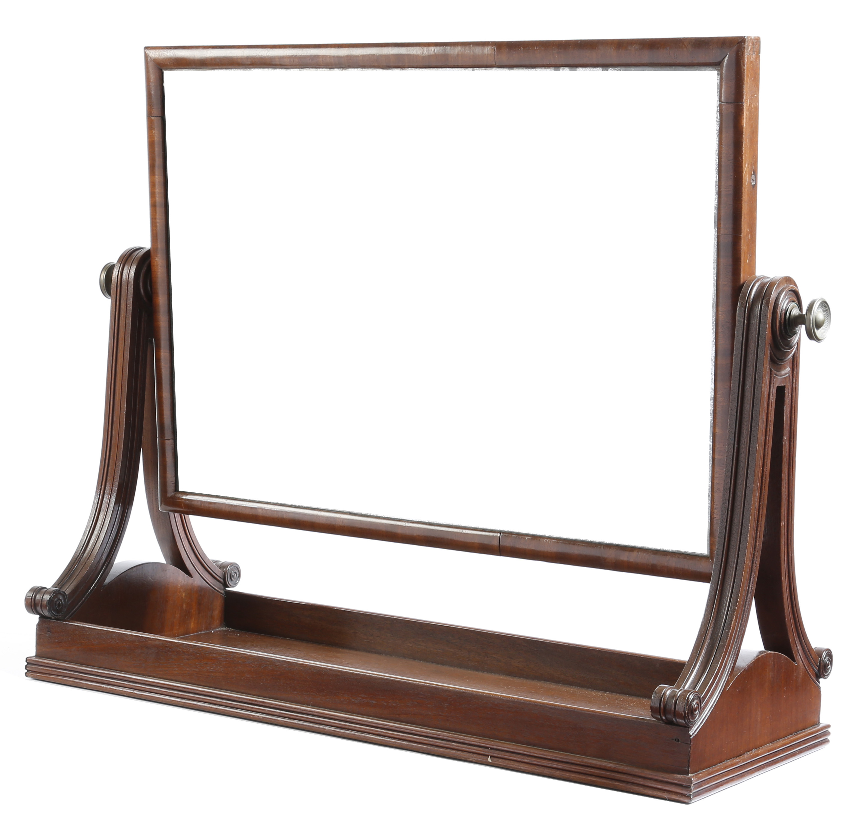 A George IV mahogany toilet mirror in the manner of Gillows, with a rectangular plate and fluted scroll supports and a rectangular tray base with a reeded edge, 53cm high, 66cm wide, 25.7cm deep.