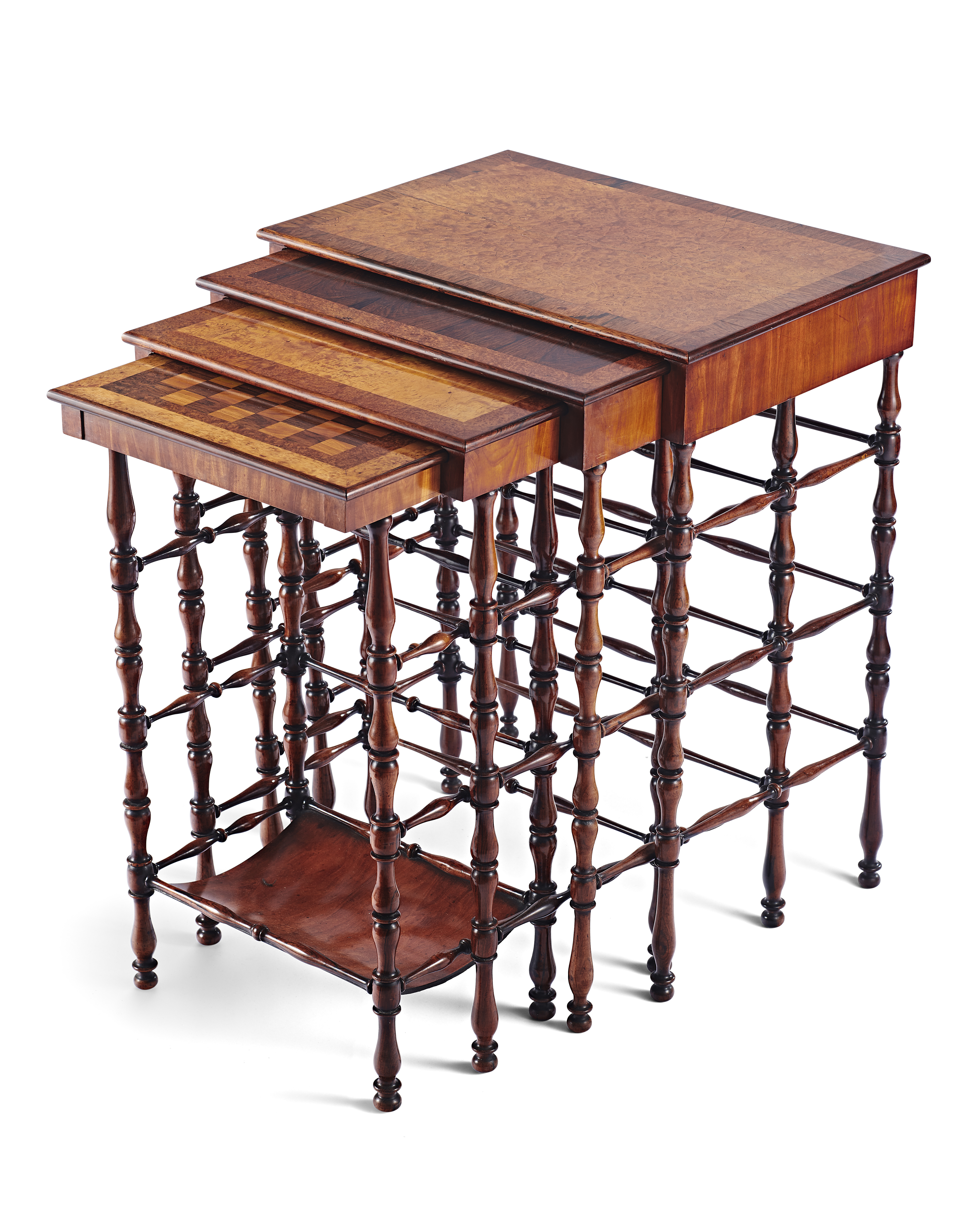 λ A quartetto nest of George IV occasional tables attributed to Gillows, the crossbanded tops veneered with amboyna, rosewood and maple, the smallest table inlaid with a rosewood and satinwood chequer board, each on rosewood baluster turned spindle supports, the smallest table with a curved undertier, 73.8cm high, 58.2cm wide, 40.4cm deep. (4)