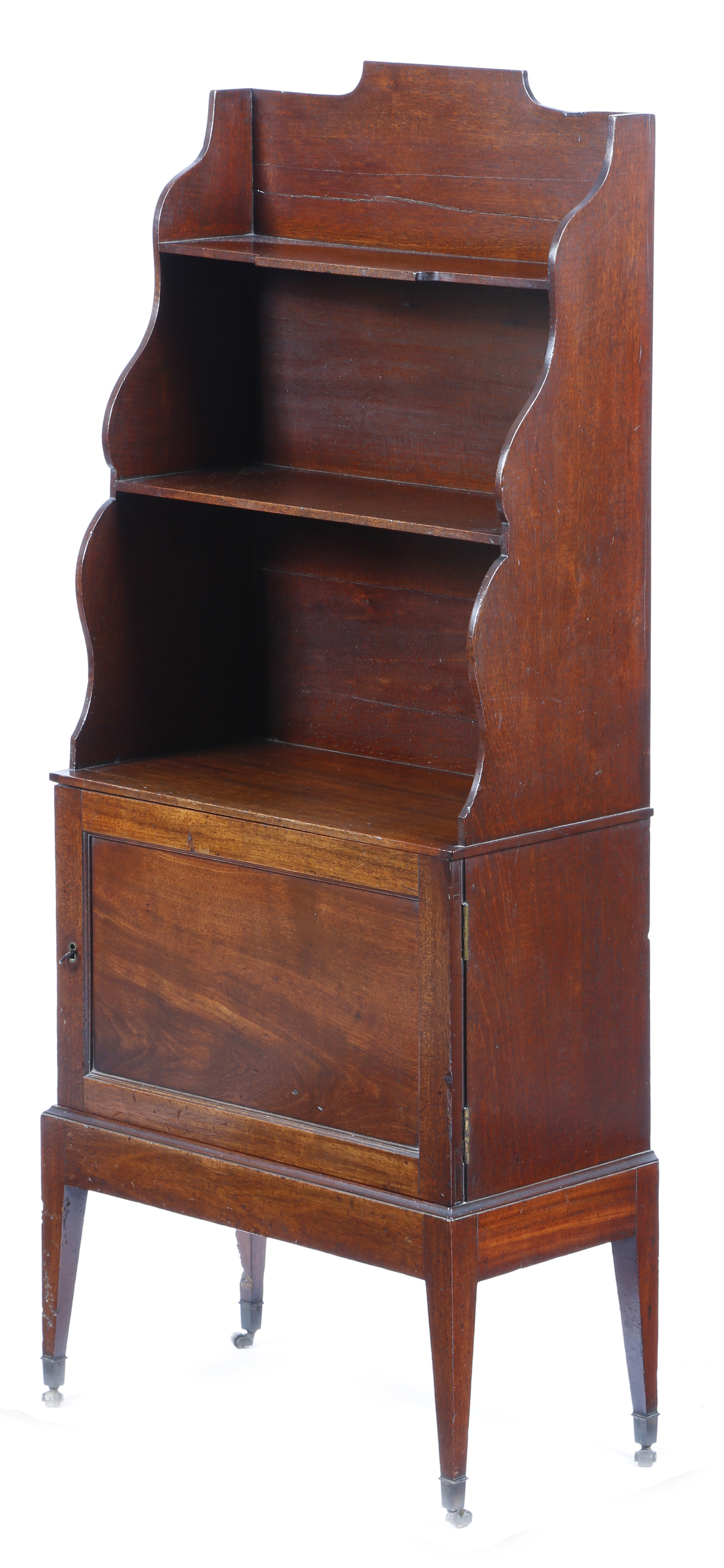 A Regency mahogany waterfall open bookcase, the base with a panelled cupboard door, on square tapering legs and brass caps and roller castors, 125cm high, 52.8cm wide, 27.3cm deep.