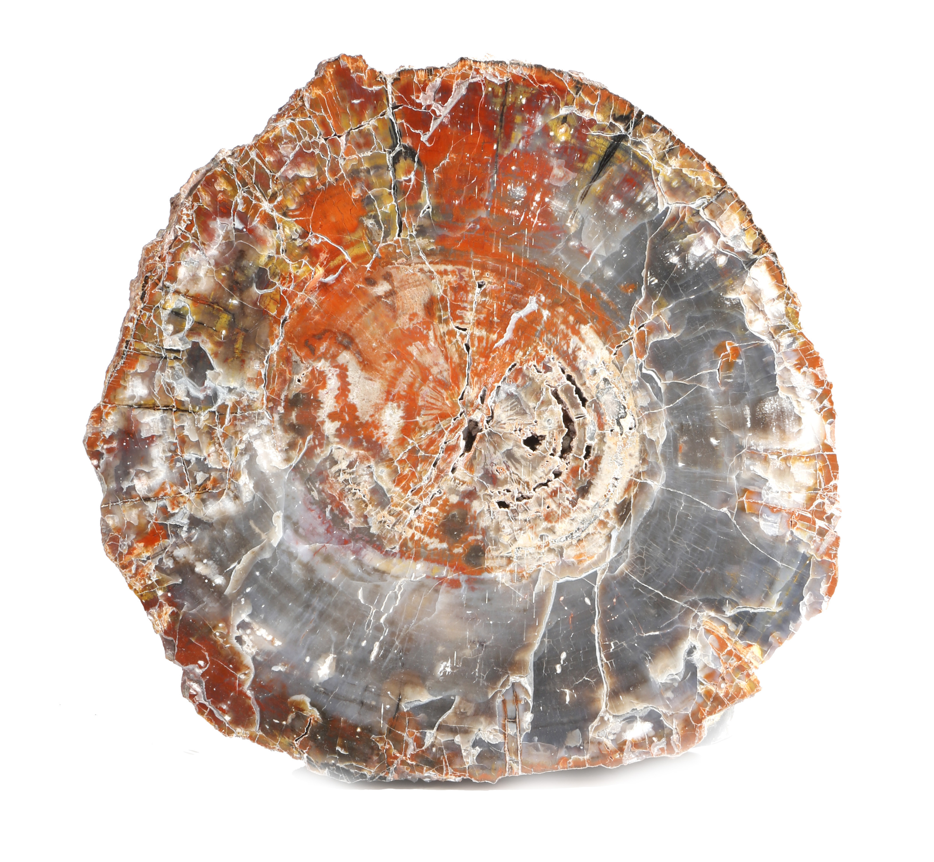 A petrified wood specimen, of sliced cross-section form, the top polished to reveal a multitude of colours, with some growth rings visible, probably Snake River, North America, Triassic period, 225 million years old, 48 x 50cm, 3cm deep.