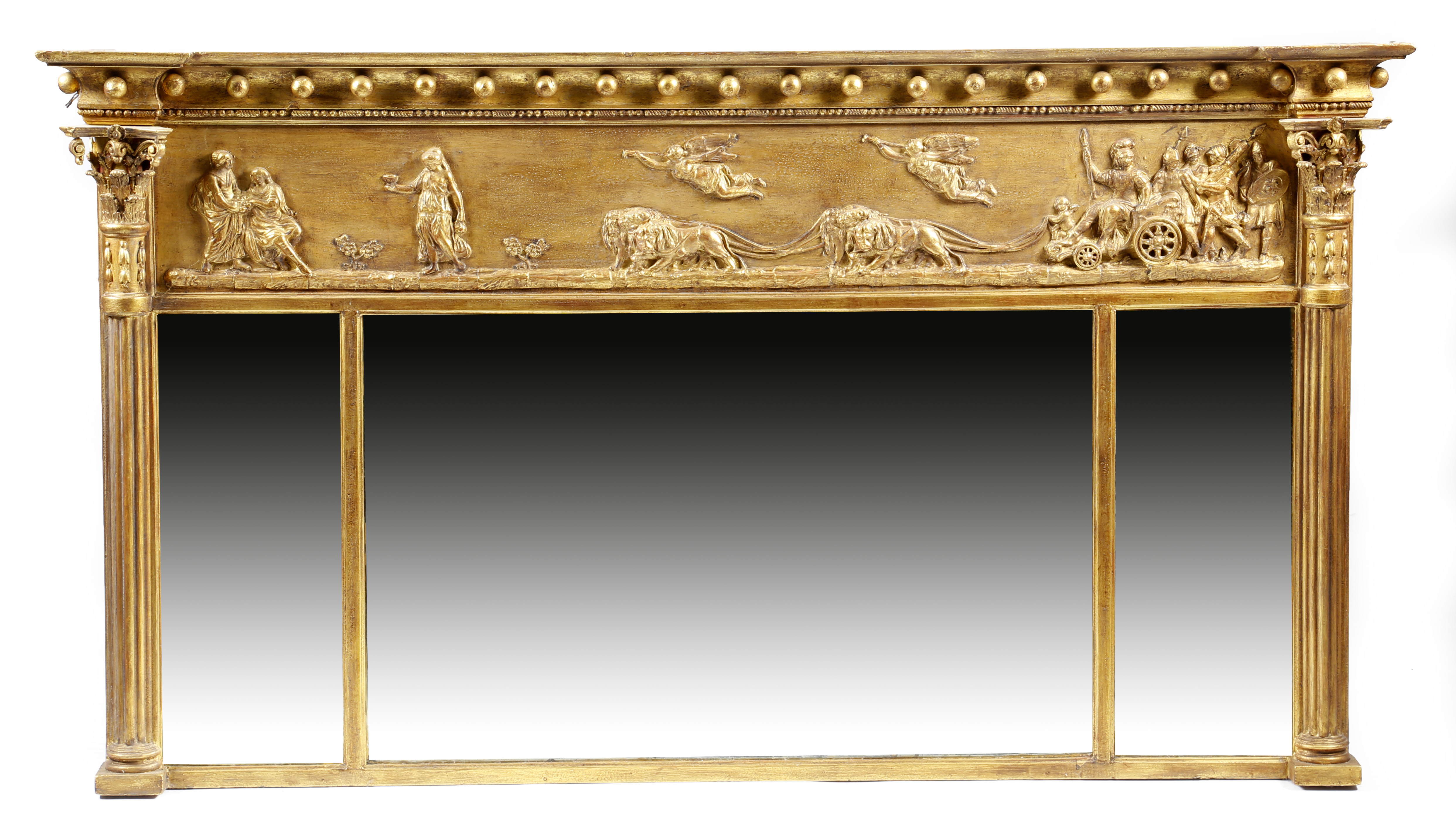 A Victorian giltwood and gesso landscape overmantel mirror, with three bevelled rectangular plates flanked by Corinthian cluster columns, the frieze decorated with Aurora leading Apollo's chariot, with a ball decorated frieze, 89.8cm high, 162cm wide.