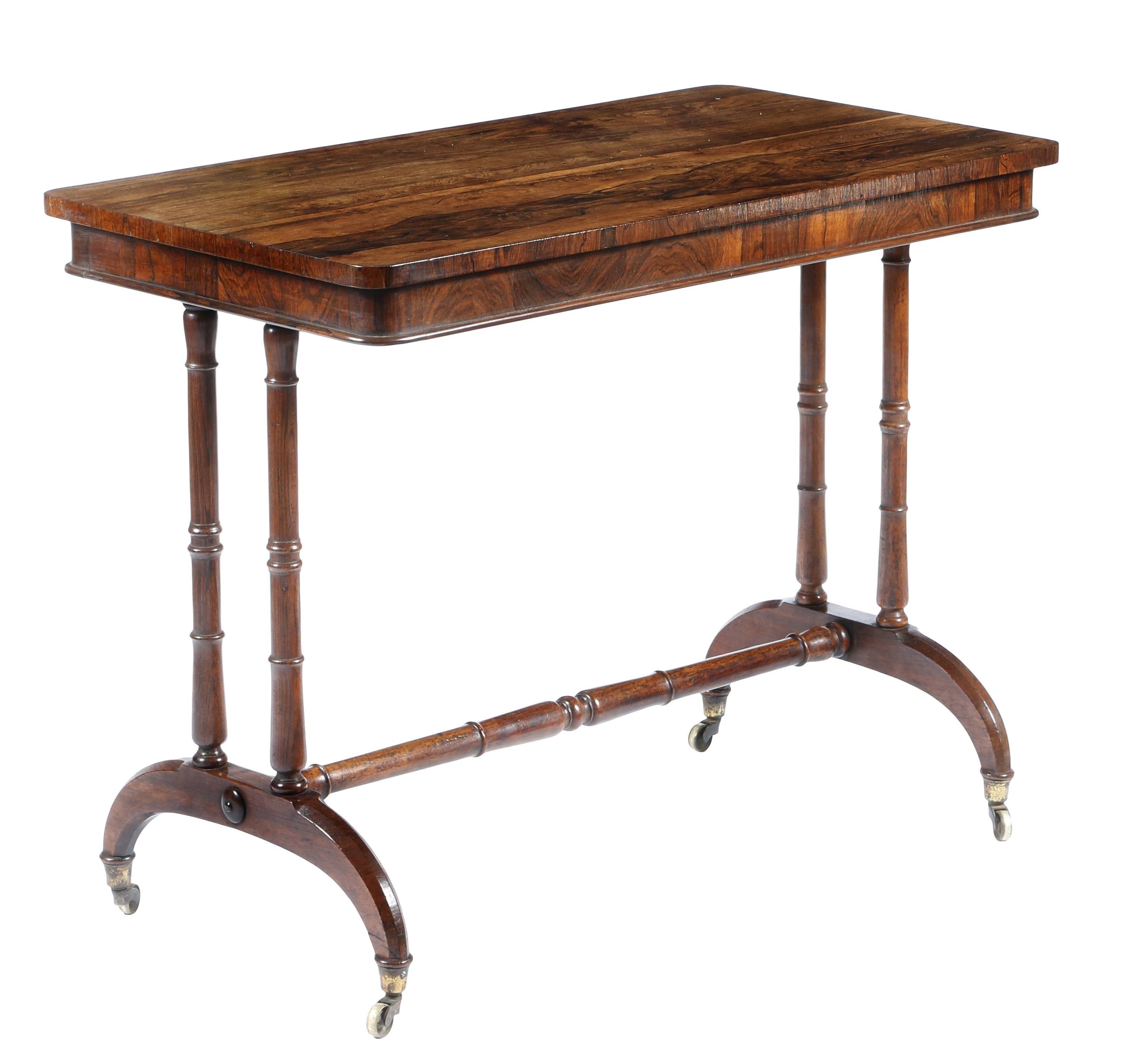 λ A George IV rosewood library table, on ring turned supports and chamfered scroll legs united by a baluster turned stretcher, on brass caps and castors, 75.5cm high, 96.6cm wide, 51.8cm deep.