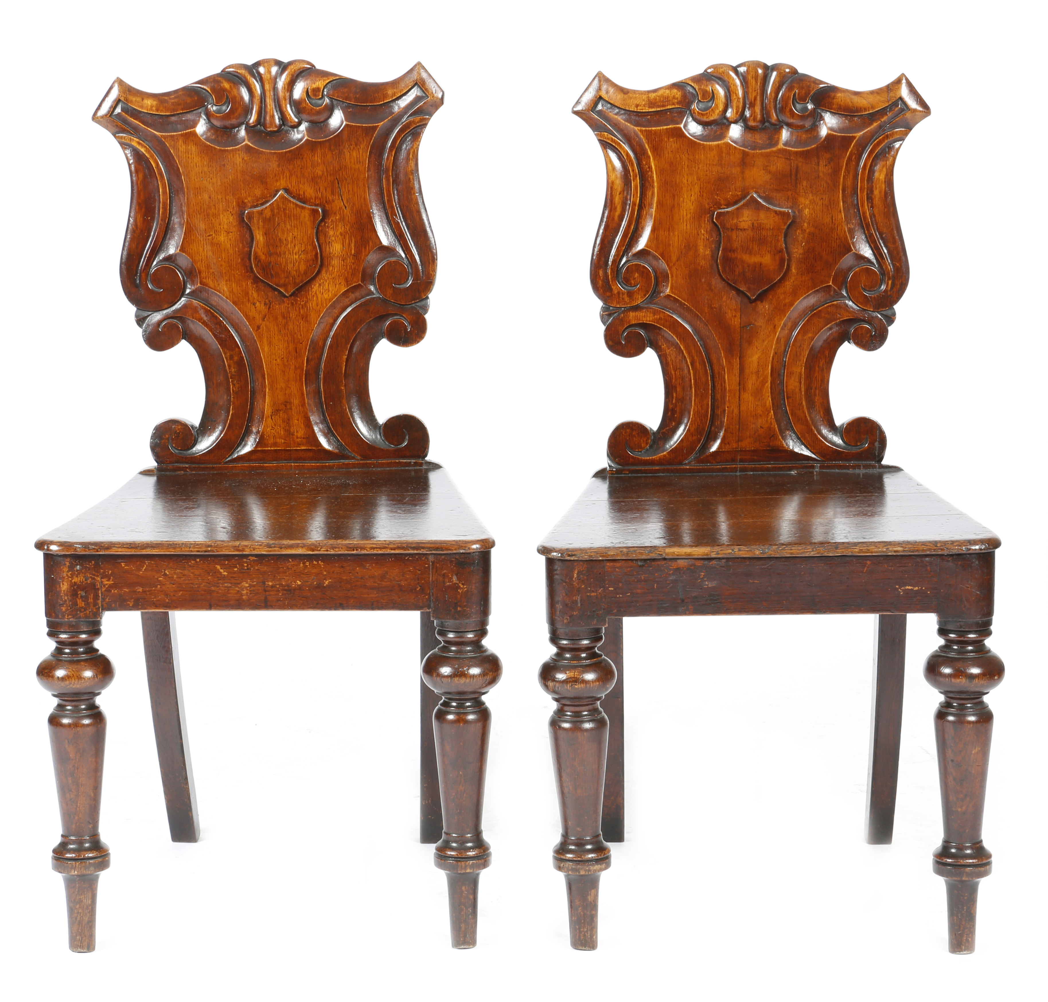 A pair of Victorian oak hall chairs, each with a scroll carved back, centred with a vacant shield, on turned front legs, possibly Irish. (2)