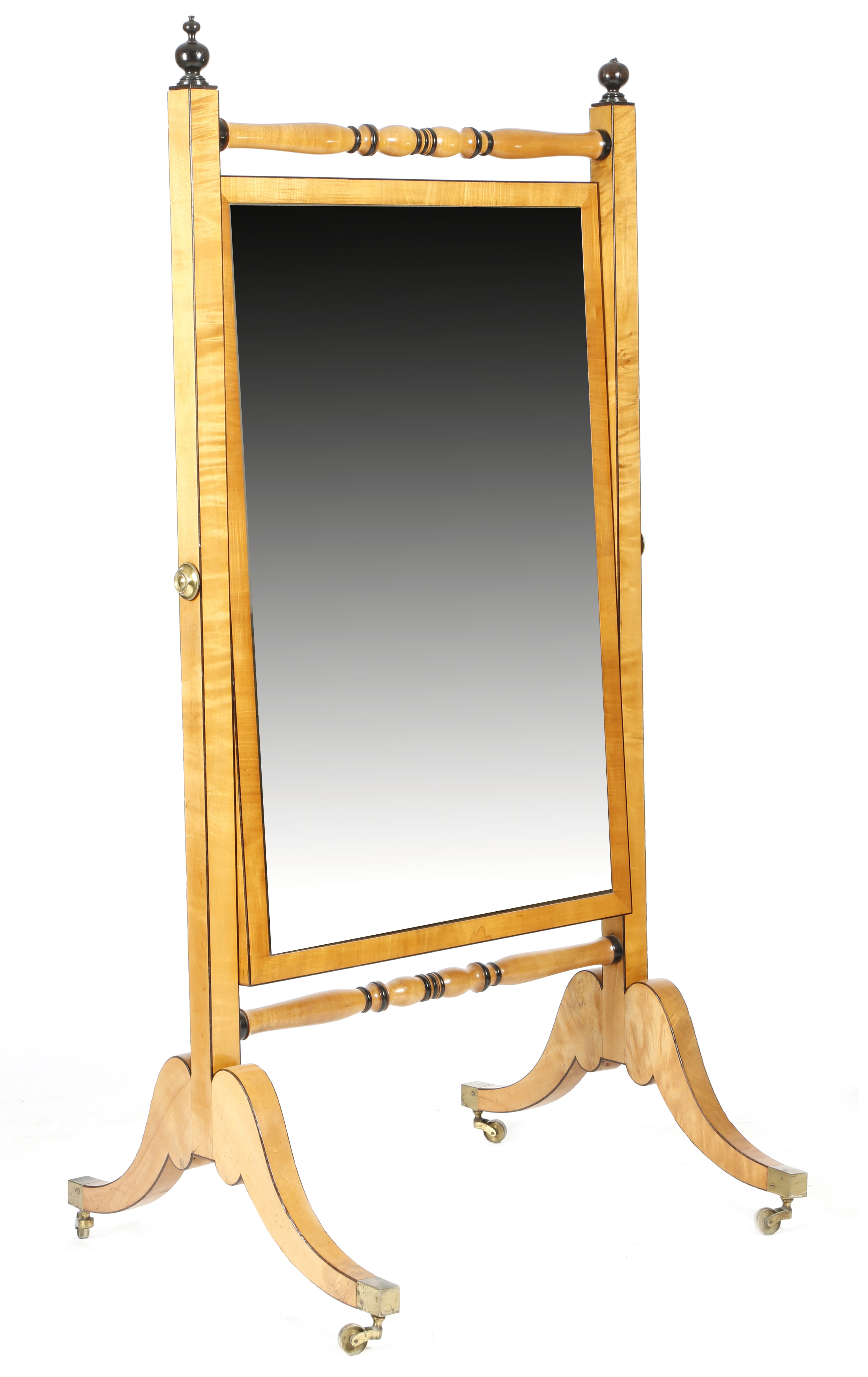 A Victorian satin birch cheval mirror, with ebonised decoration, the rectangular plate between square uprights, united by turned stretchers, with vase finials and on brass caps and castors, 174.4cm high, 83cm wide, 75cm deep.