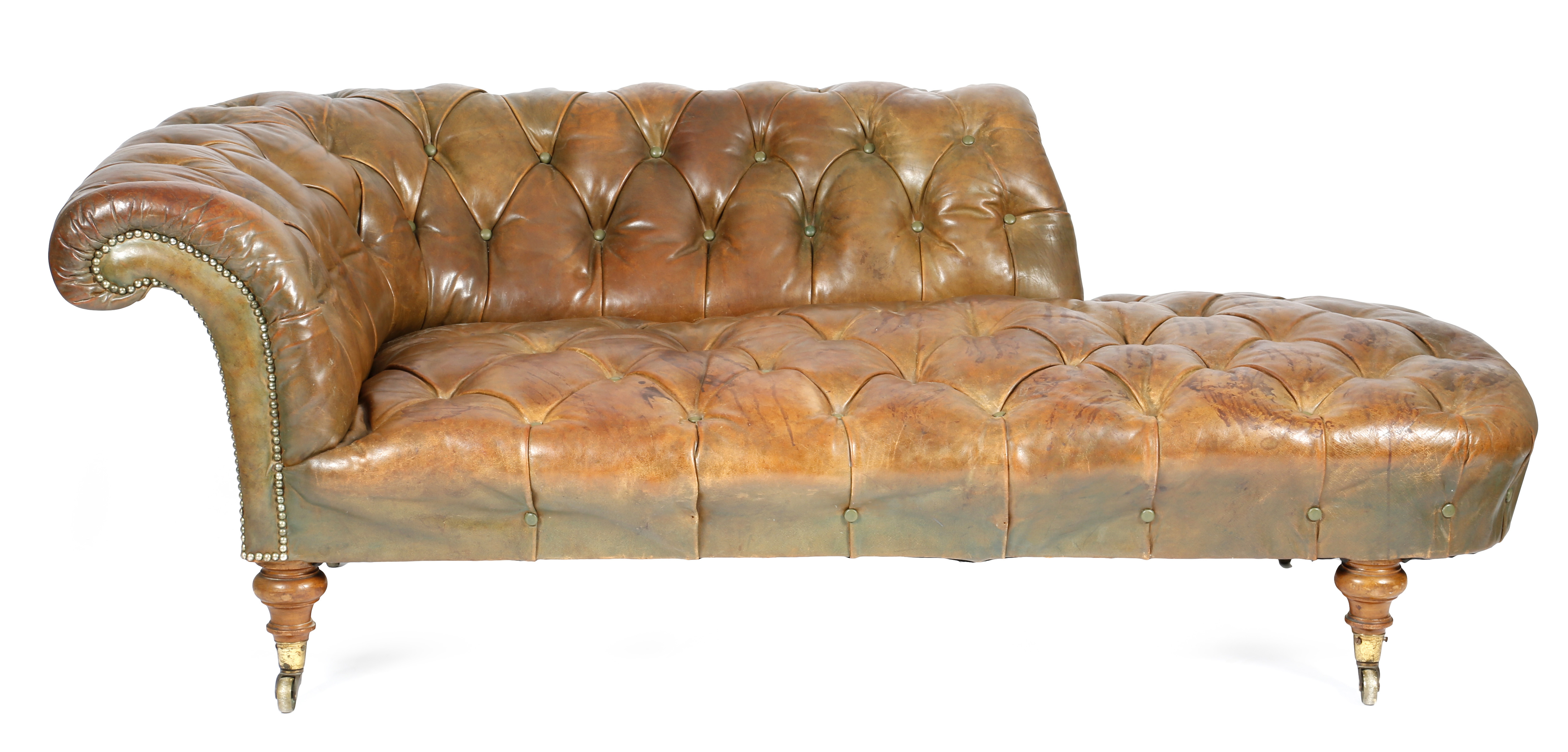 A Victorian day bed, later button upholstered with leather, on walnut supports and brass caps and castors, stamped 'COPE COLLINSON PATENT', inside of the back left leg stamped '4532', 64cm high, 186cm long, 103cm deep.