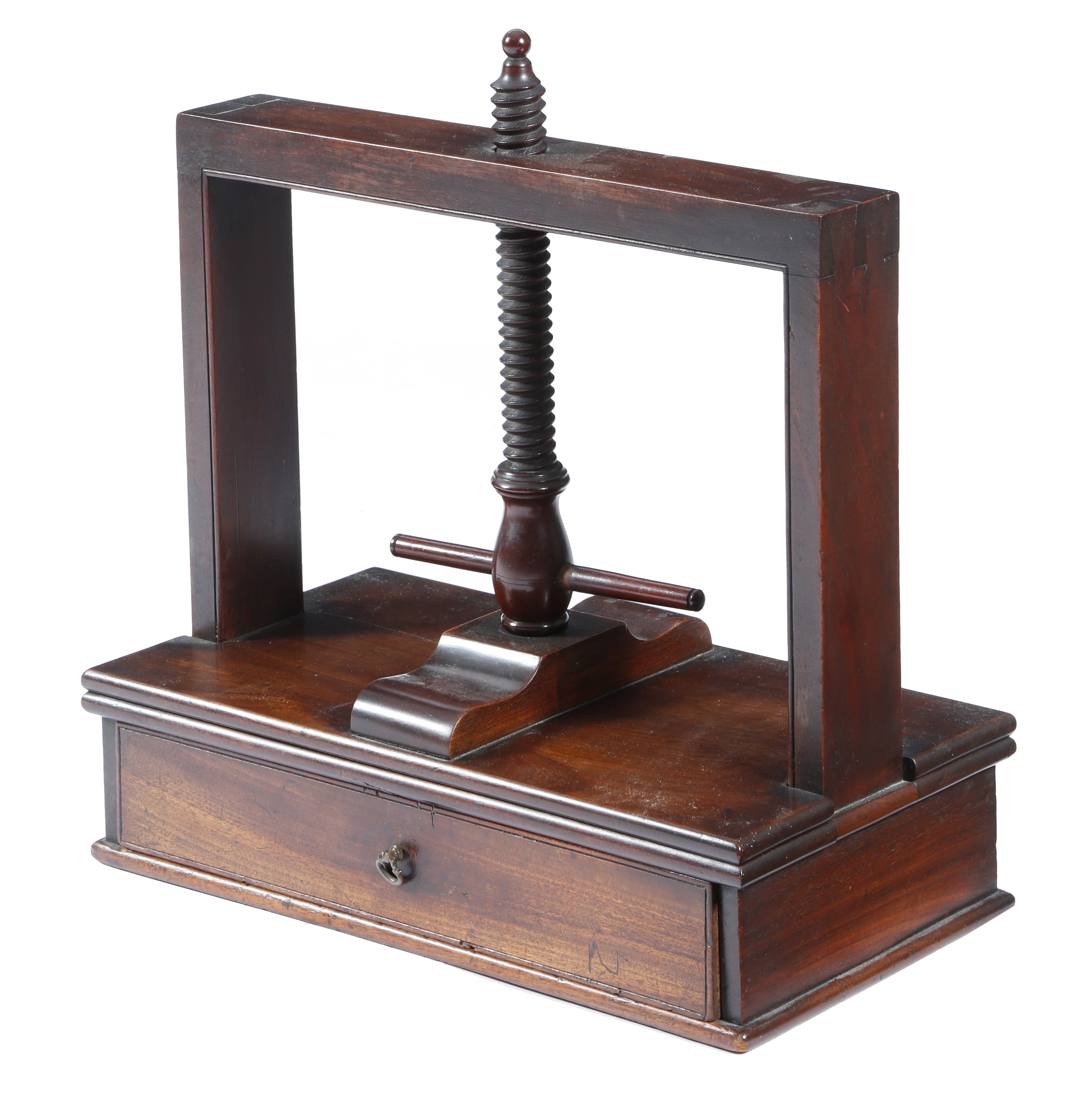 An early 19th century mahogany table book or linen press, the base fitted with a drawer, 43.4cm high, 40.7cm wide, 21.9cm deep.