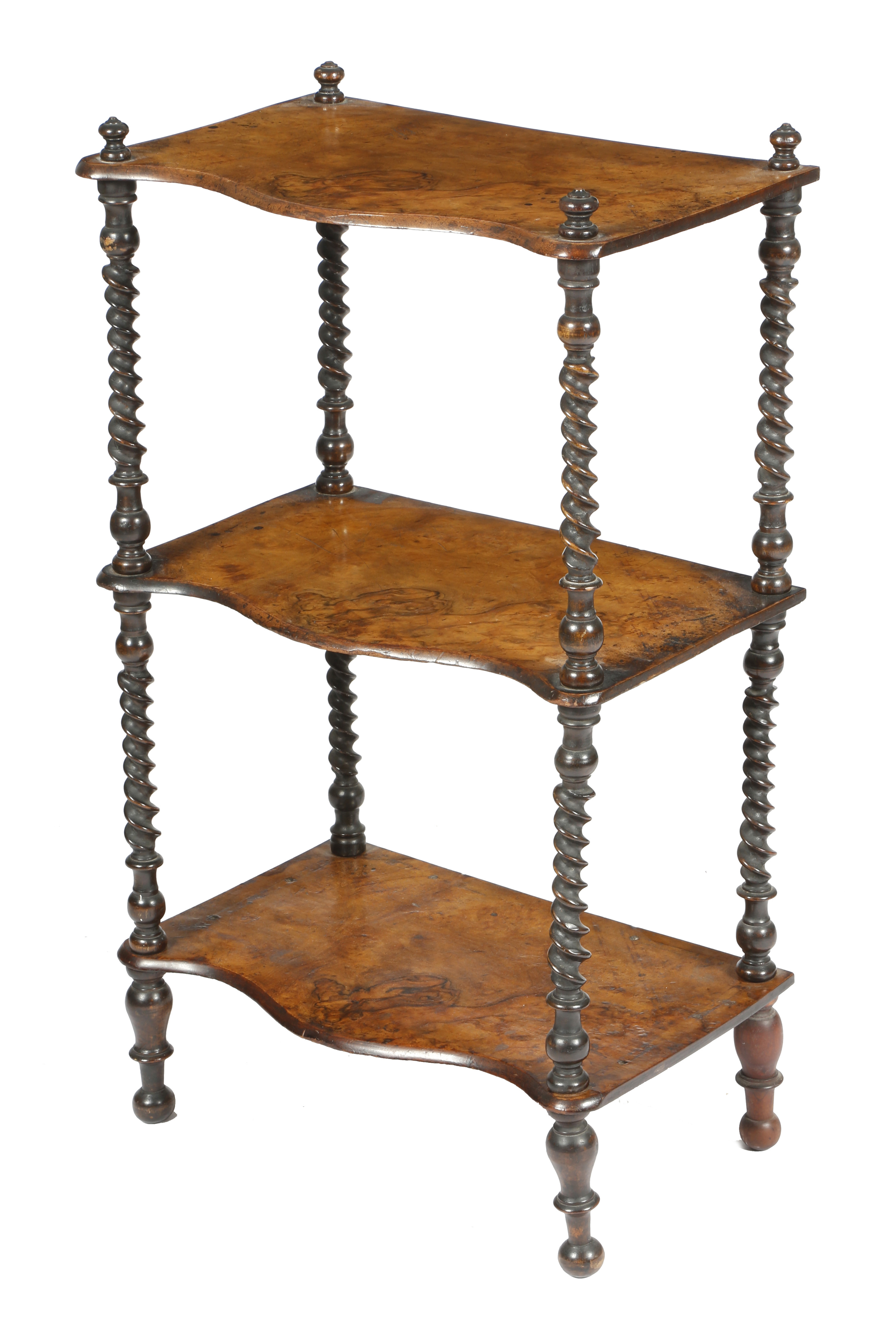 A Victorian walnut three-tier whatnot, with a serpentine front and spiral twist supports, 88cm high, 51cm wide, 32cm deep.