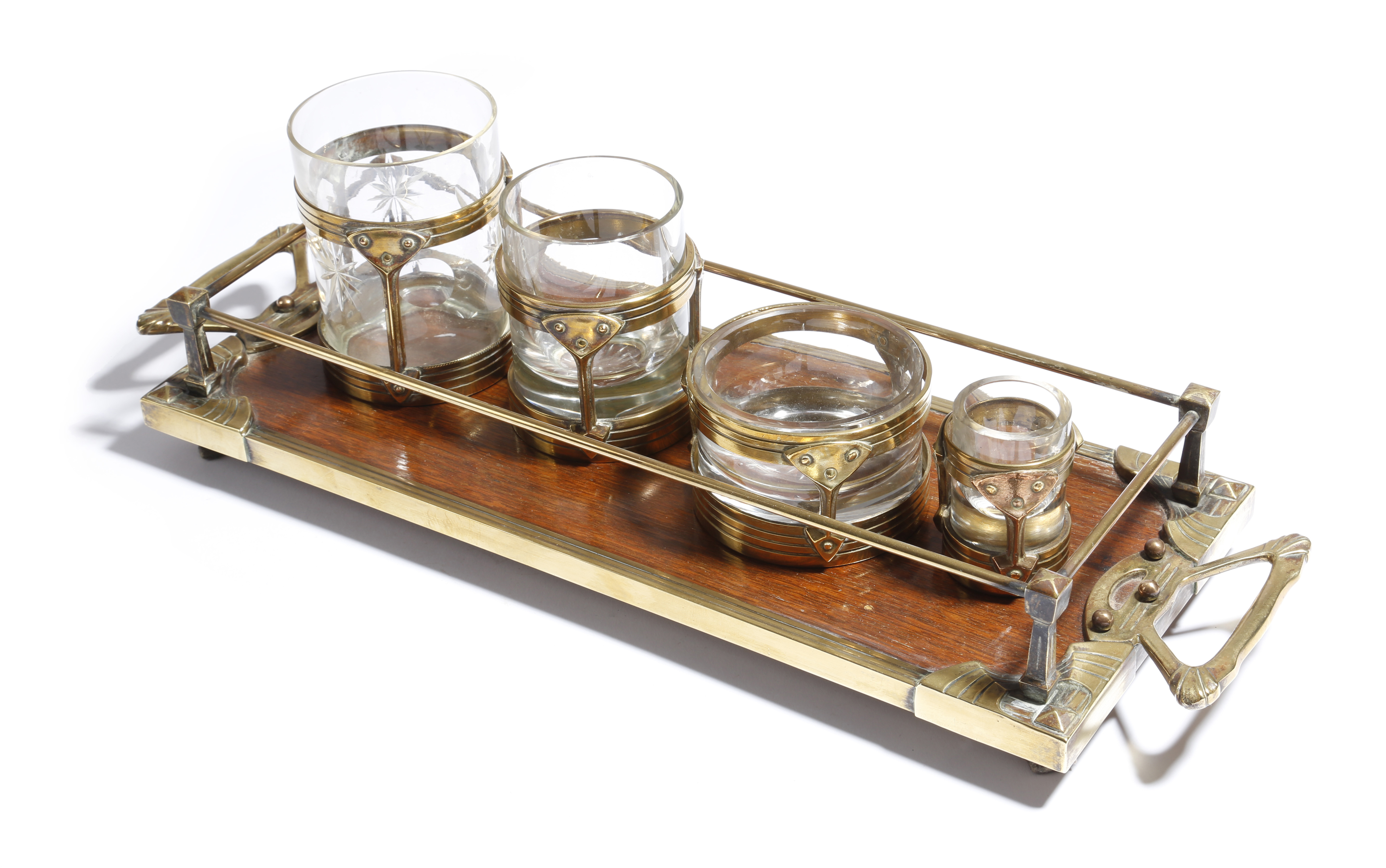 A late Victorian maritime style captain's tray, with a gallery and a pair of handles, with four tumblers, each in a brass glass holder, 44cm wide. (5)