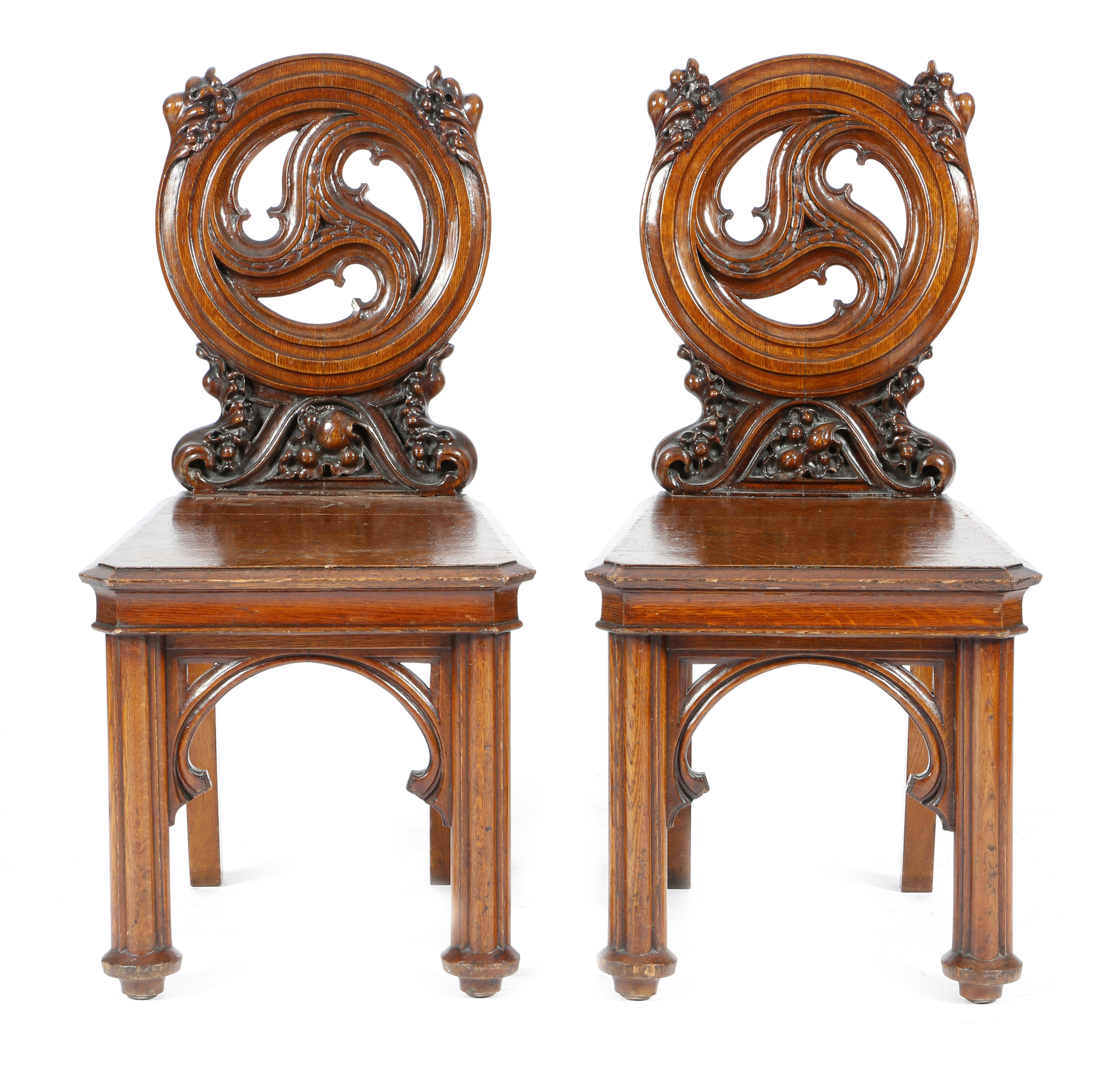 A pair of Victorian Scottish oak hall chairs in Pugin style by Wylie & Lochhead, each with a Gothic pierced rondel back carved with oak leaves and acorns, above a solid seat with a moulded edge, on cluster column front legs united by a pierced arch, the rails stamped '2015 WYLIE & LOCHHEAD GLASGOW'. (2)
