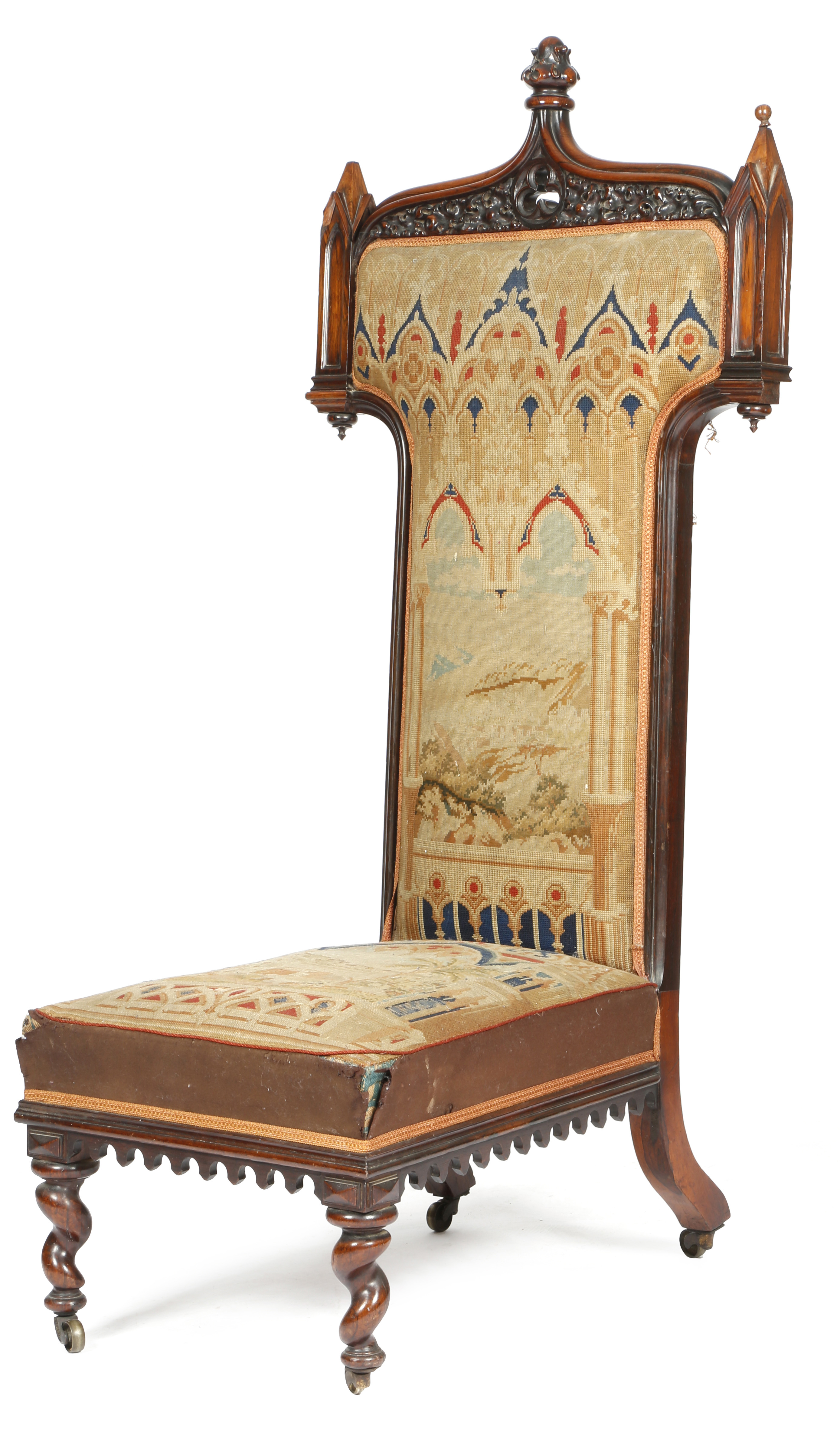 λ An early Victorian rosewood Gothic style prie dieu, carved with oak leaves, pinnacles and a trefoil motif, the padded back and seat covered with contemporary needlework, on brass castors.