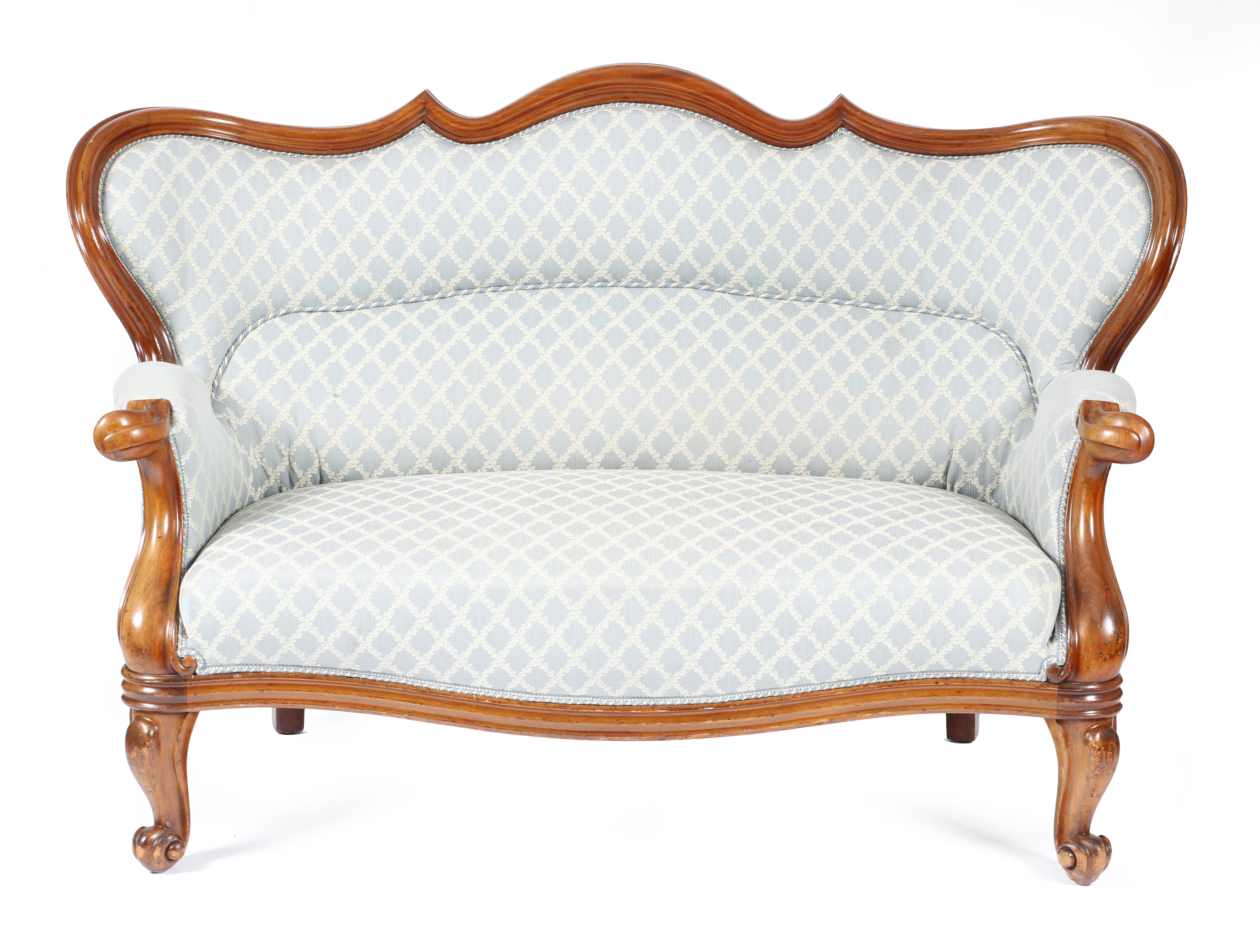 A Victorian mahogany two seater sofa, with a moulded showframe and a serpentine wing back, on cabriole front legs and scroll toes, 105.6cm high, 160.5cm wide, 76cm deep.
