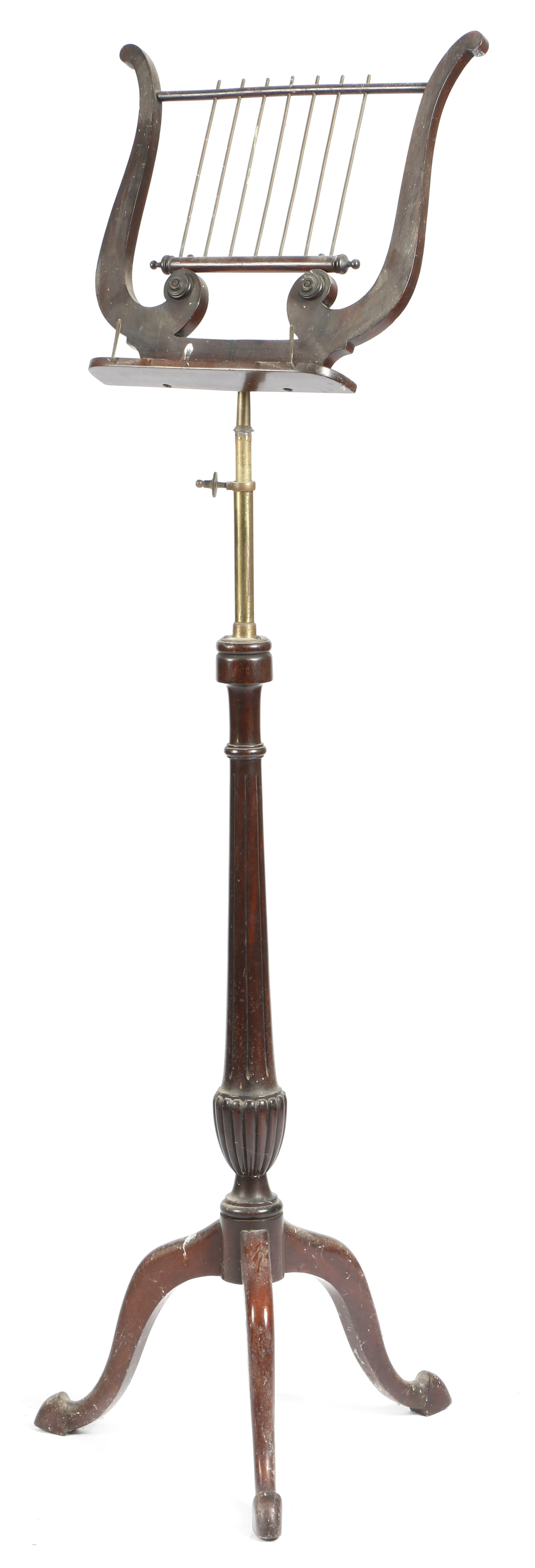 A mahogany and brass music stand in Regency style, the lyre rest on an adjustable brass stem, on tripod supports, 172.5cm high (max), 43.2cm wide.