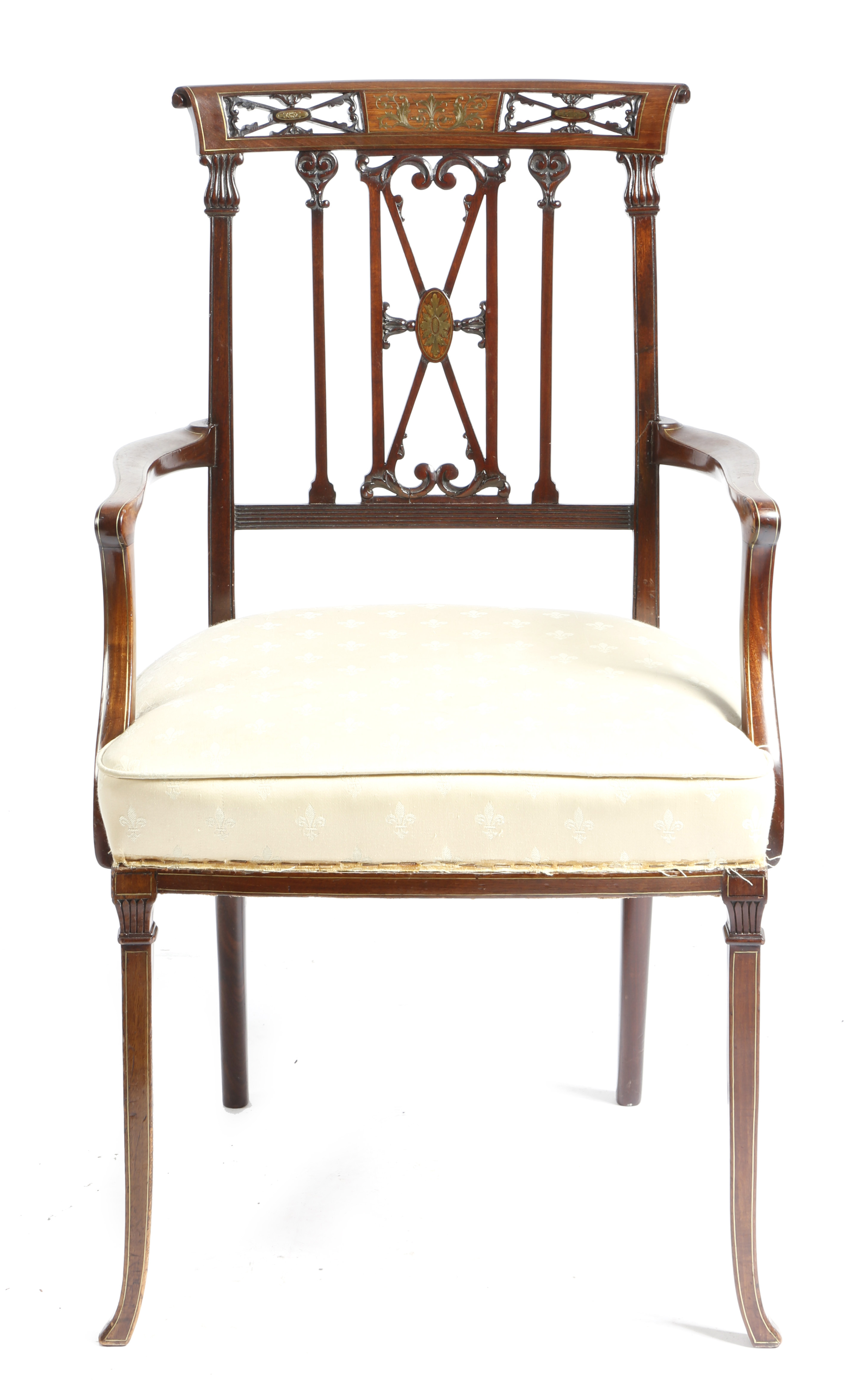 λ A late Victorian mahogany and brass inlaid open armchair