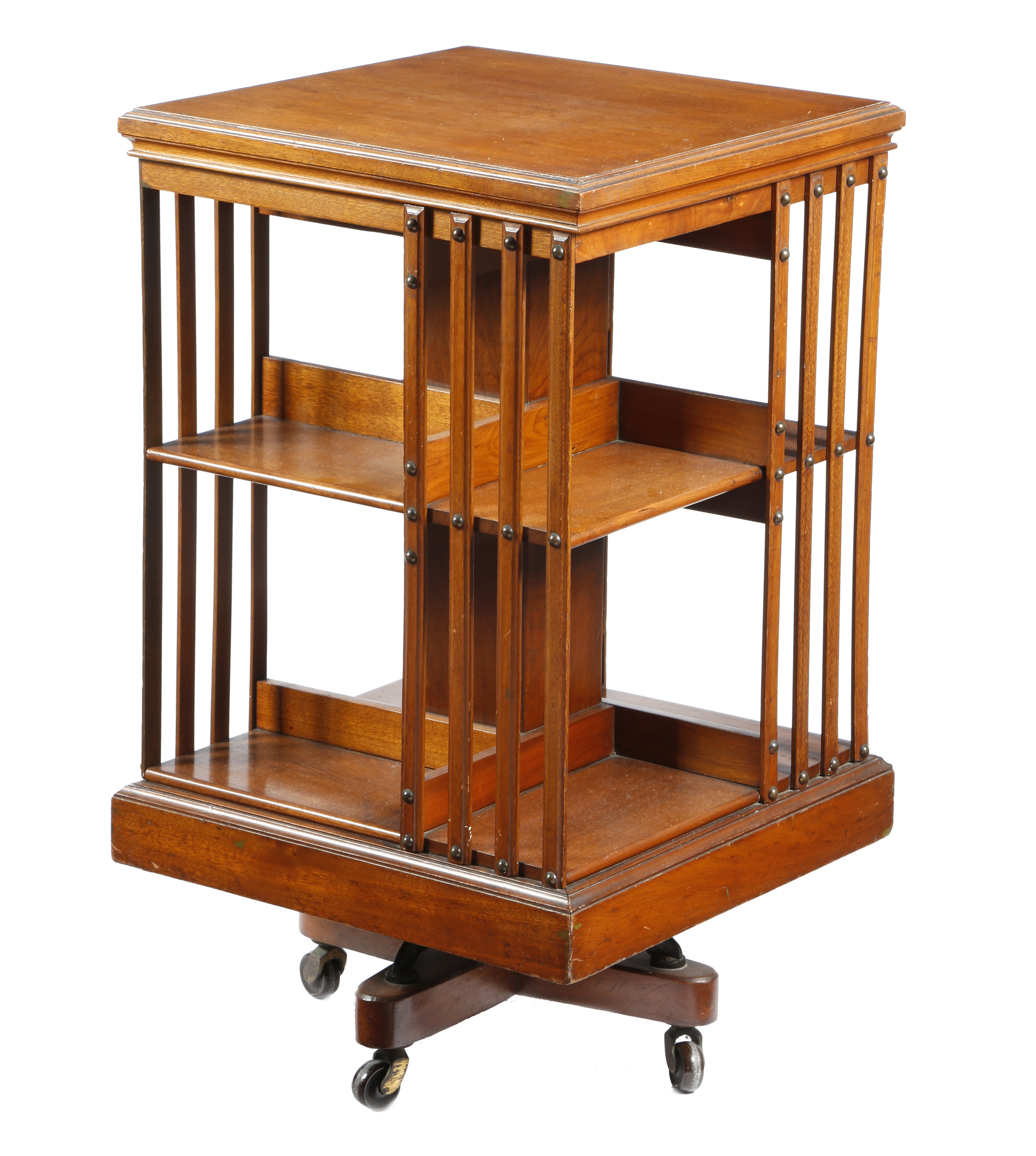 An Edwardian walnut revolving bookcase, on ceramic castors, 86cm high, 49cm square.