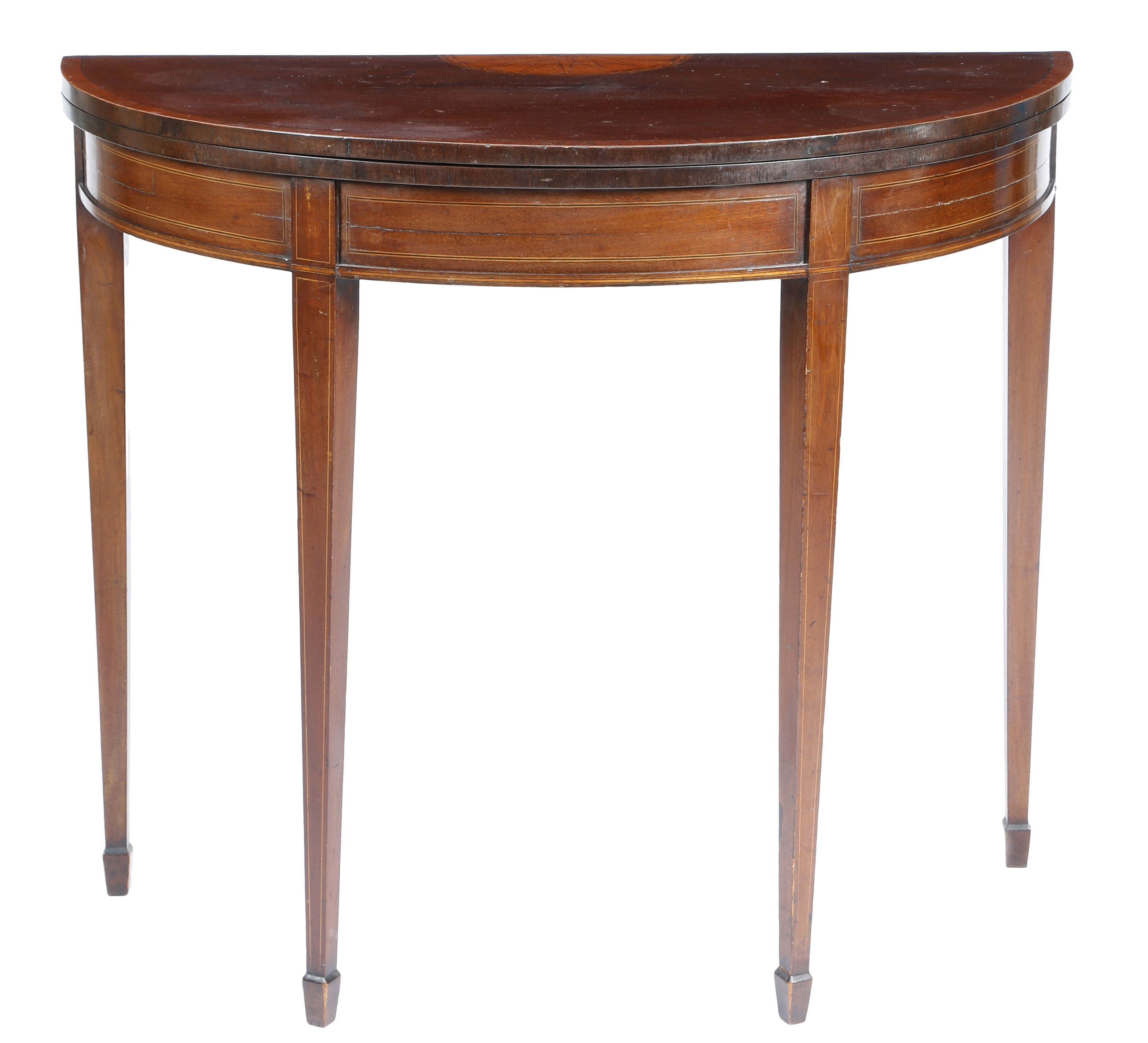 A late Victorian mahogany demi-lune card table, inlaid with stringing, the fold-over top with satinwood crossbanding and a marquetry sunburst, on a single gate support, 77.4cm high, 91.5cm wide, 45.2cm deep.