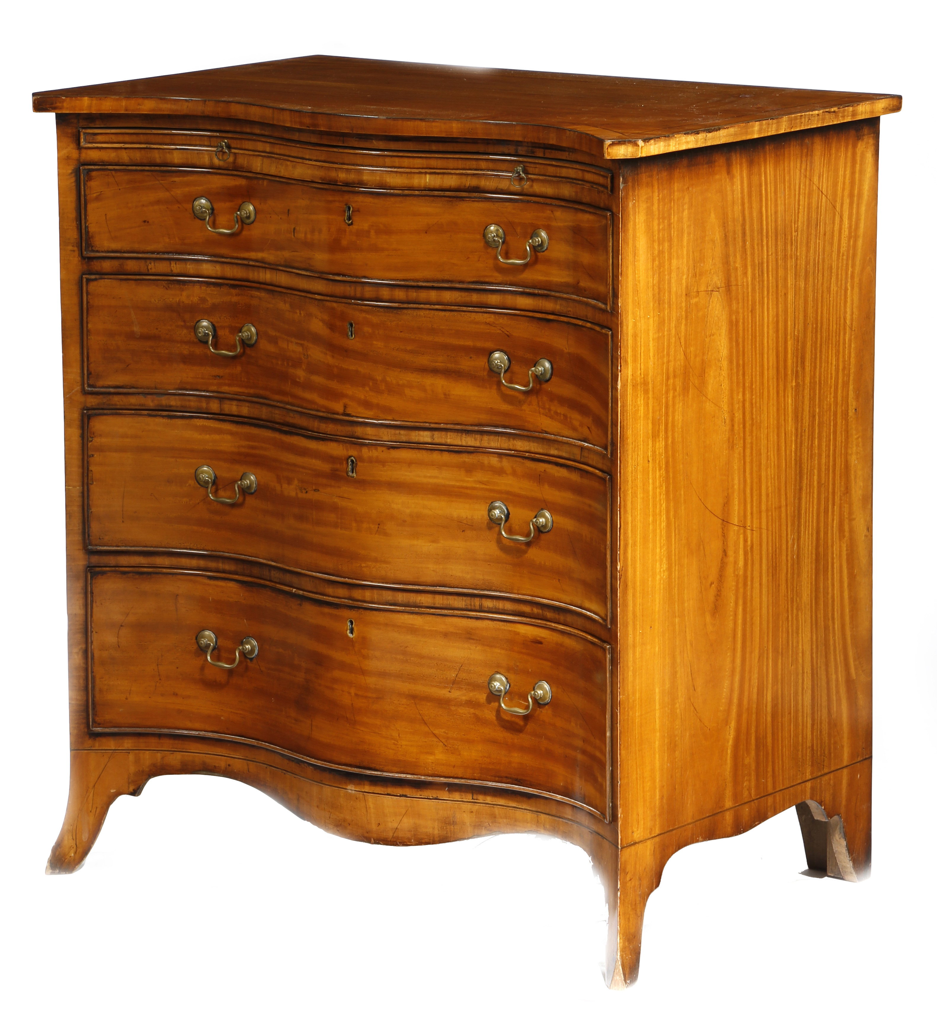 A satinwood serpentine chest in George III style, the crossbanded top above a baize lined brushing slide and four long graduated drawers, on bracket feet, late 19th / early 20th century, 88cm high, 80.1cm wide, 53.2cm deep.