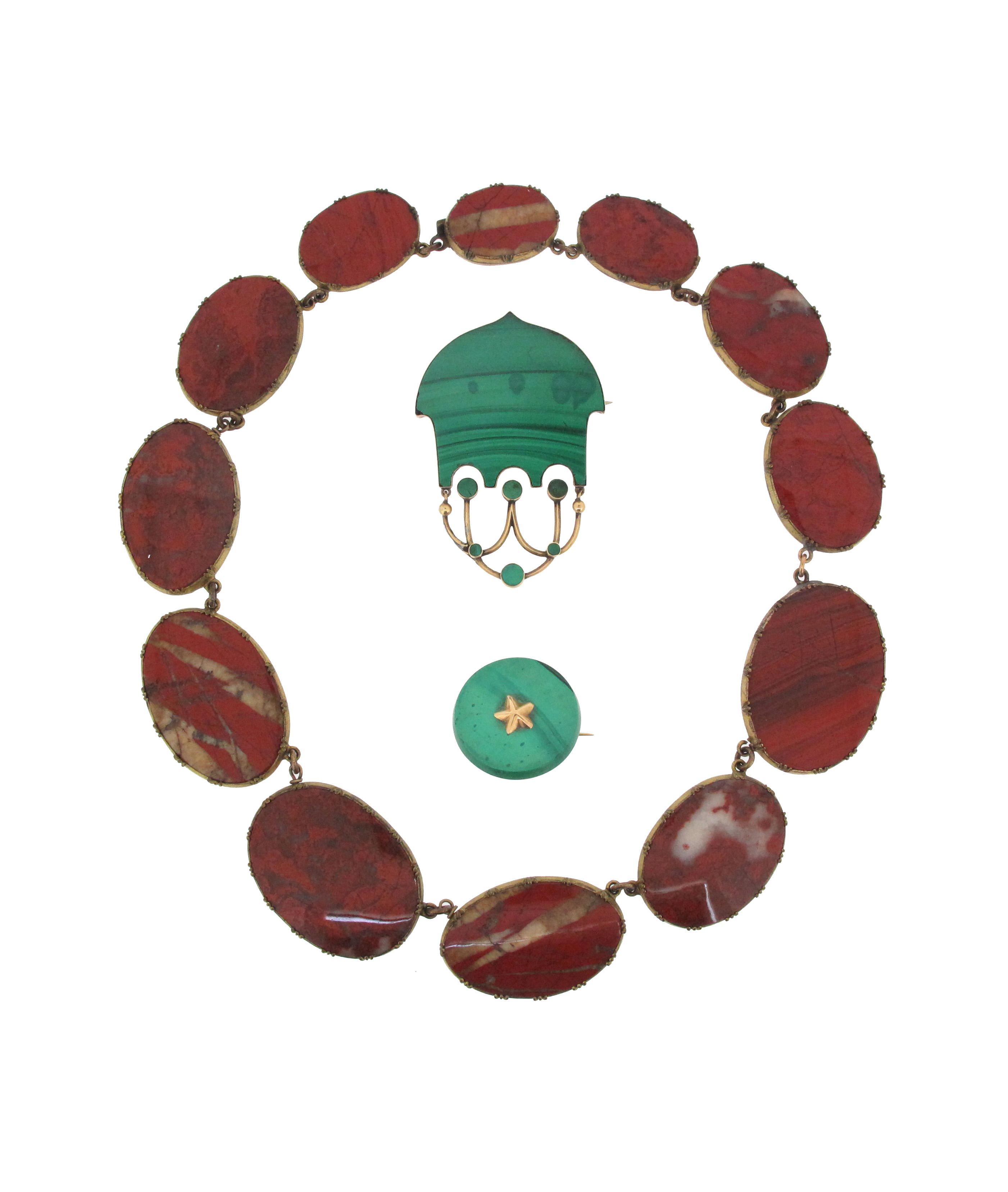 An early 19th century jasper riviƩre, the graduated stones set in gilt-metal cut down collets, 40cm long, with a Russian circular malachite brooch set with a gold star, Russian marks to reverse, 2.6cm wide, and a malachite-mounted articulated gold brooch, 5.9cm high