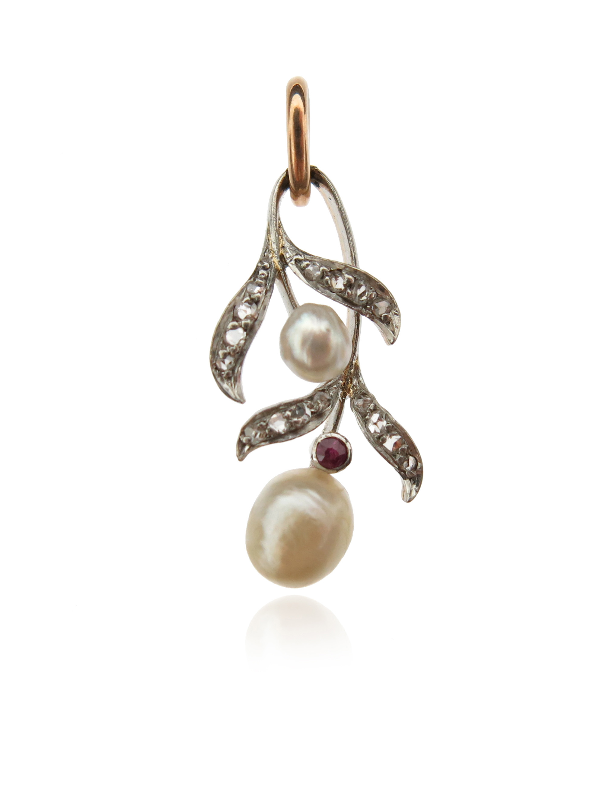 A foliate pendant mounted with two pearls and rose-cut diamond-set leaves