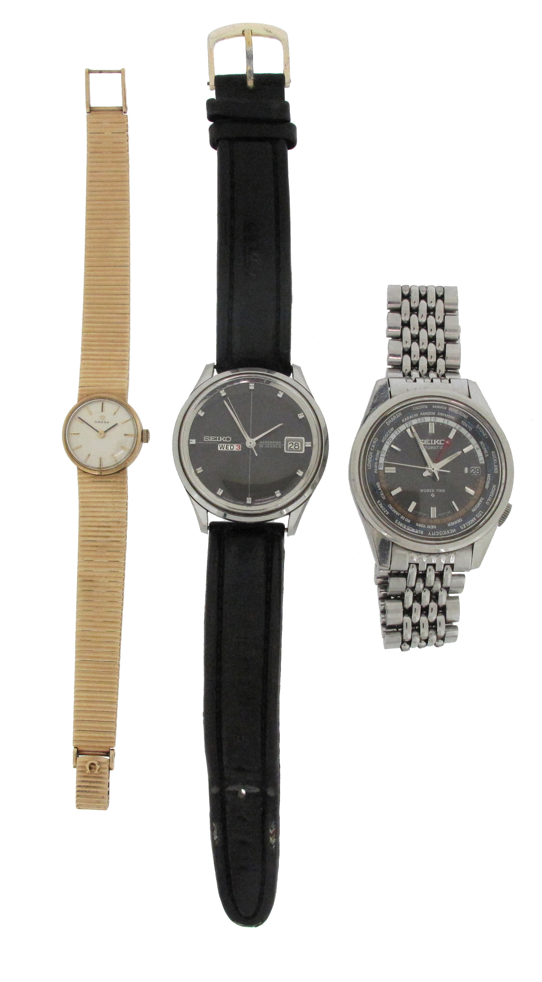 A lady's 9ct gold Omega wristwatch, signed gold dial, baton numerals, manual movement, on fancy-link gold band, Omega case, with a gentleman's steel Seiko wristwatch, automatic movement, date aperture at 3, on articulated steel band, with another gentleman's steel wristwatch by Seiko, automatic movement, date aperture at 3.00 and day aperture at 9, on leather band