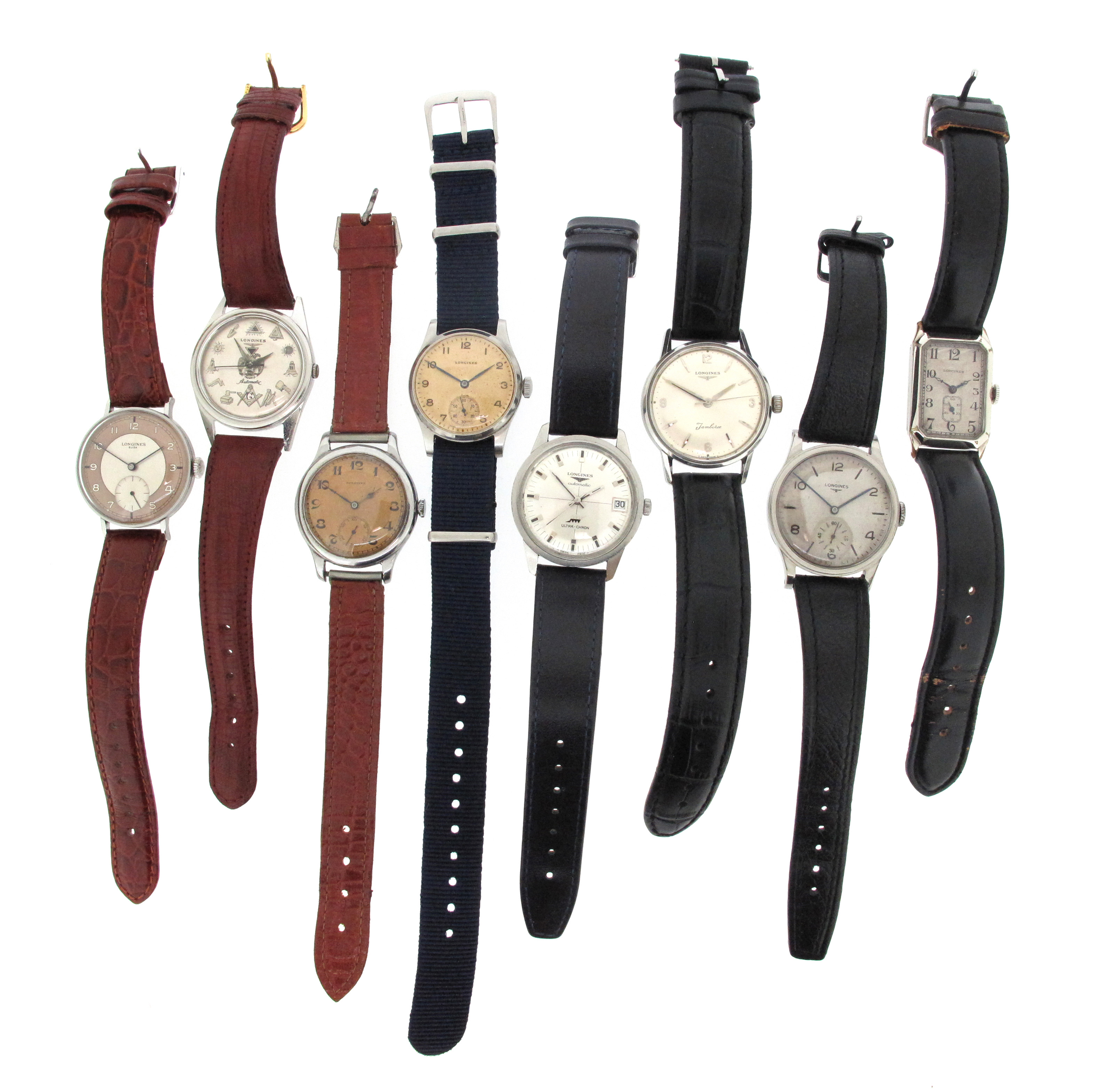 A collection of eight steel wristwatches by Longines, two with automatic movements, six with manual movements on leather or fabric bands