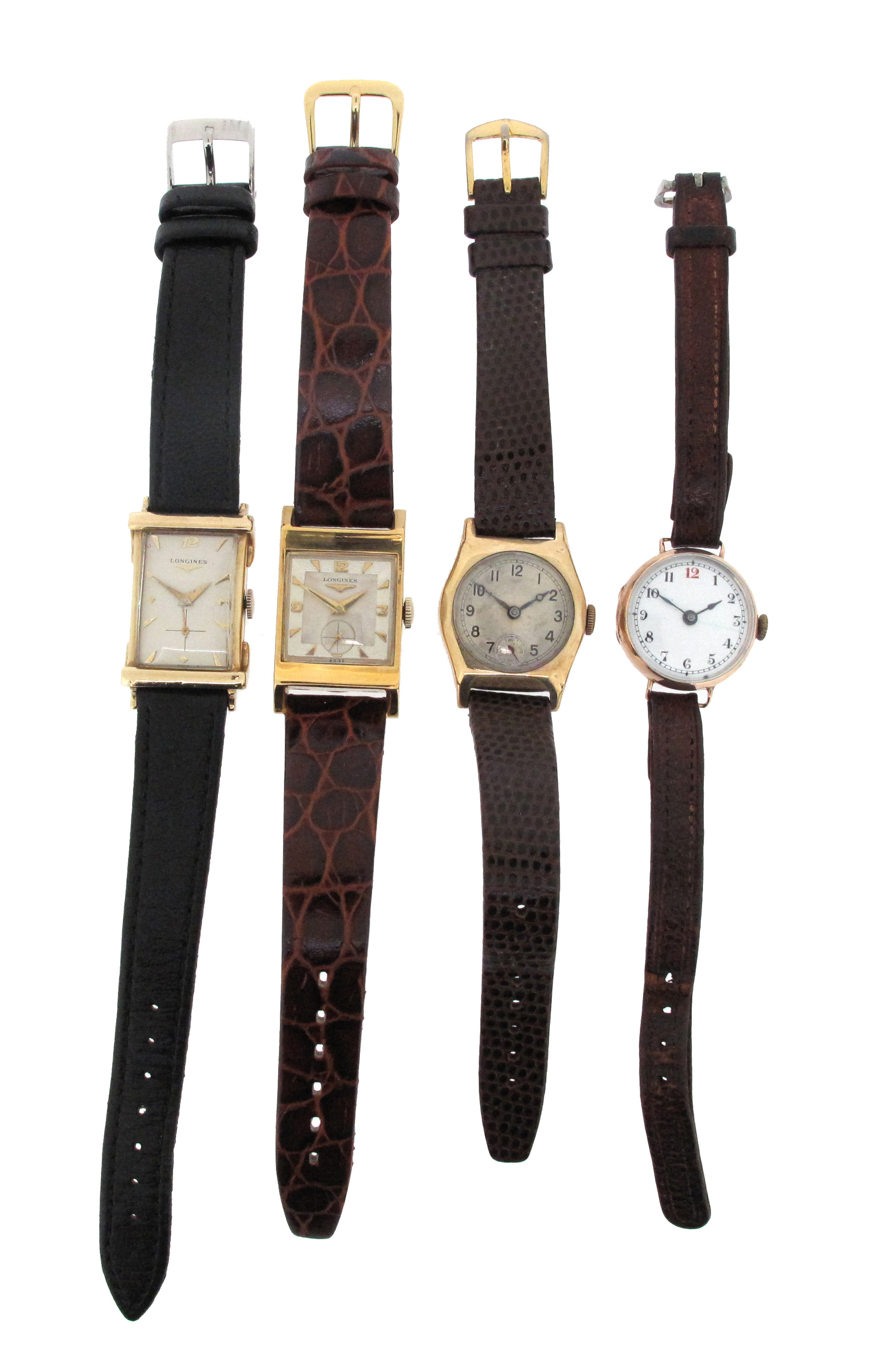 Four gold wristwatches by Longines, manual movements, gold cases, on leather bands, two Longines cases