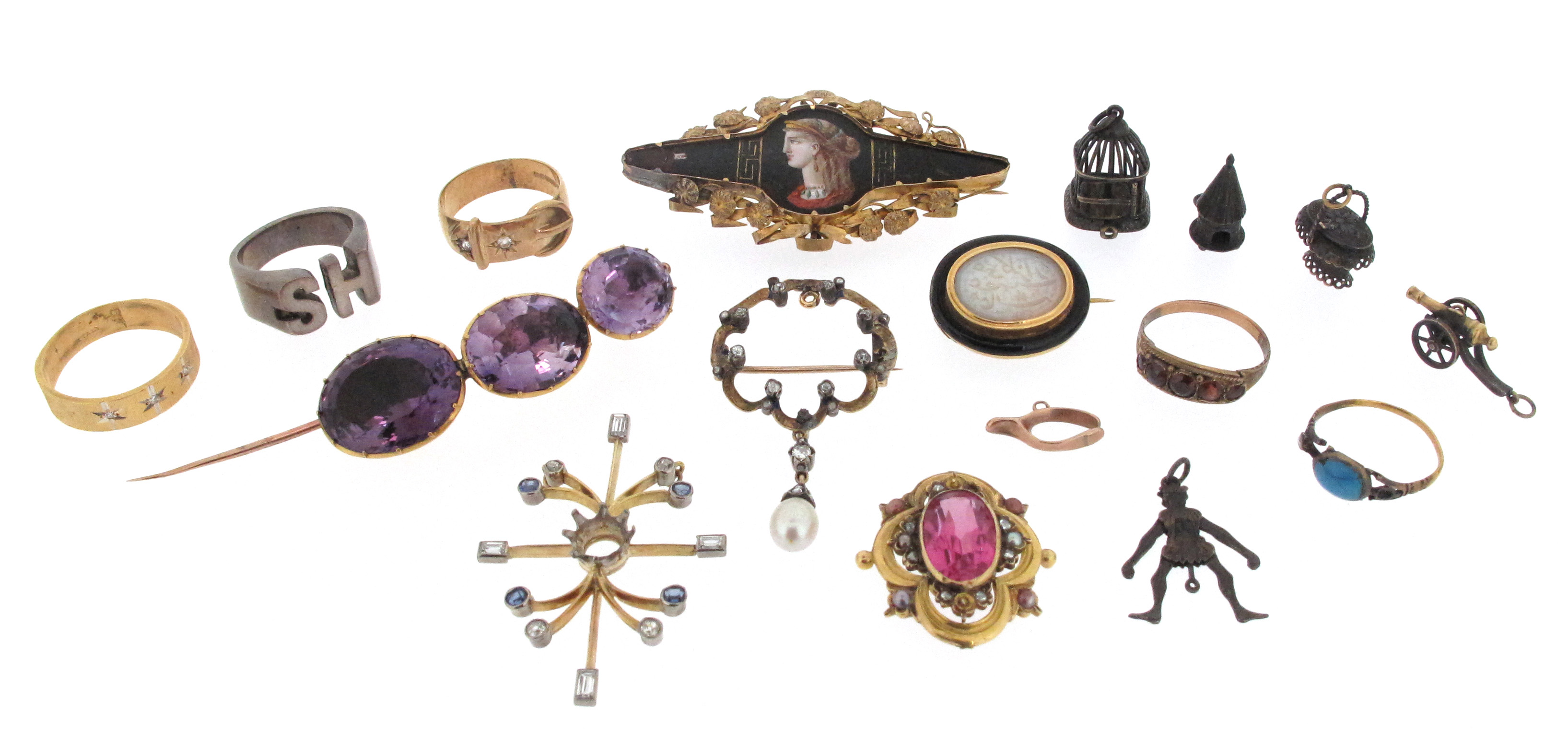 Various items of jewellery etc., including a damaged gold circular brooch, set with small diamonds and suspending a drop-shaped pearl, a gold brooch mounted with three graduated oval-shaped amethysts in closed-back cut-down collets, a pink stone-set gold mount set with seed pearls, five rings, three brooches and six assorted charms