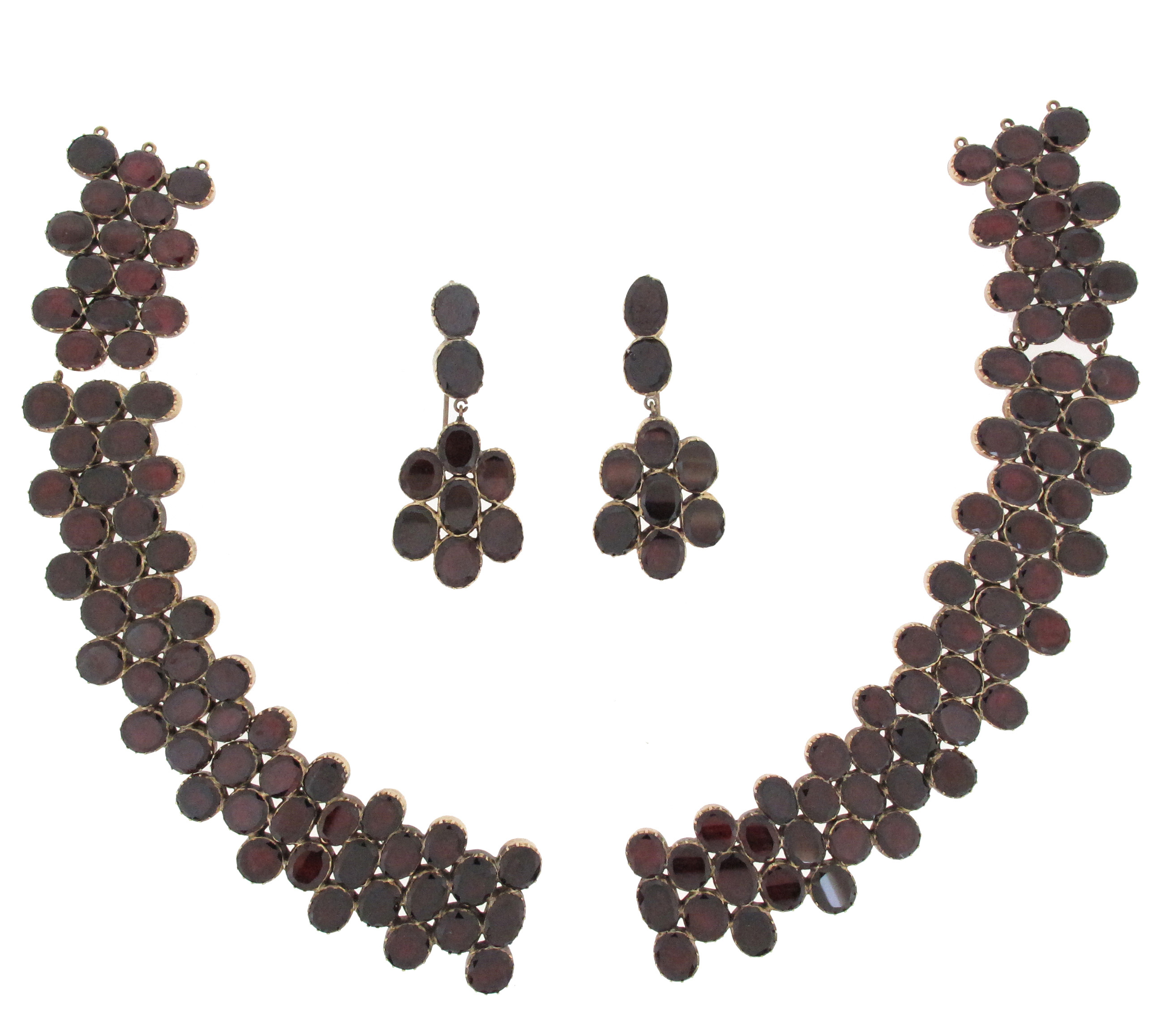 Articulated gold sections of a George III-style necklace, mounted with flat oval-cut garnets in gold cut-down collets, with matching garnet-set cluster earrings