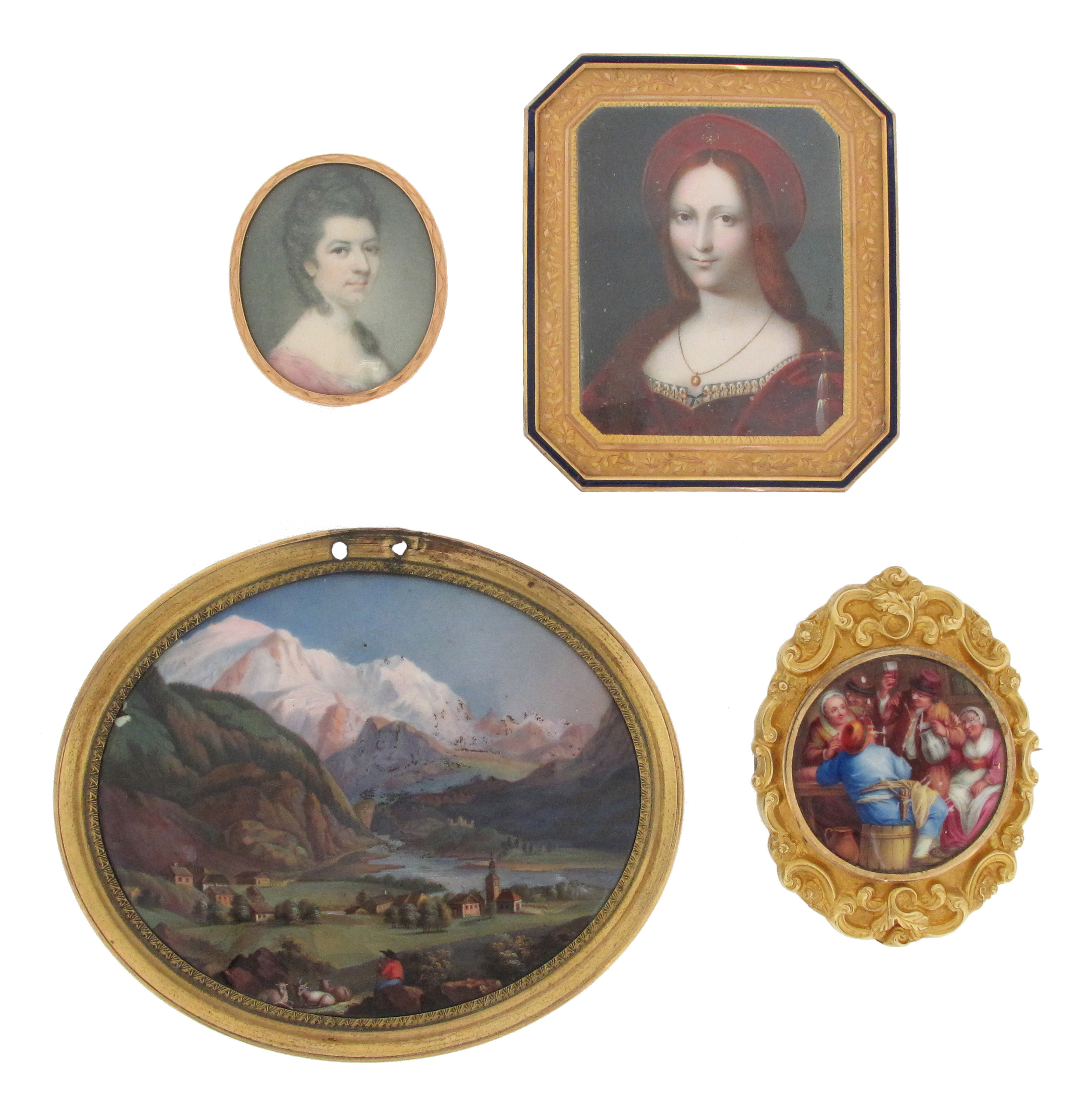 Four portrait miniatures, including an oval miniature portrait of a rural scene, probably Swiss, with a Shepherd and three sheep in the foreground, village buildings in the centre and snow-capped mountains in the distance, in gilt metal frame, 8.5cm wide, an 18th century miniature portrait of a lady with pink dress, probably painted on ivory, a miniature painting of a woman in the Renaissance style wearing a red dress and head dress, painted on ivory, two-colour gold frame with foliate chased border within blue enamel surround, 5.5cm high, a circular miniature painting depicting a scene of revelers in the 18th century style, painted in enamel on porcelain within an ornate gold frame, 3.5cm high