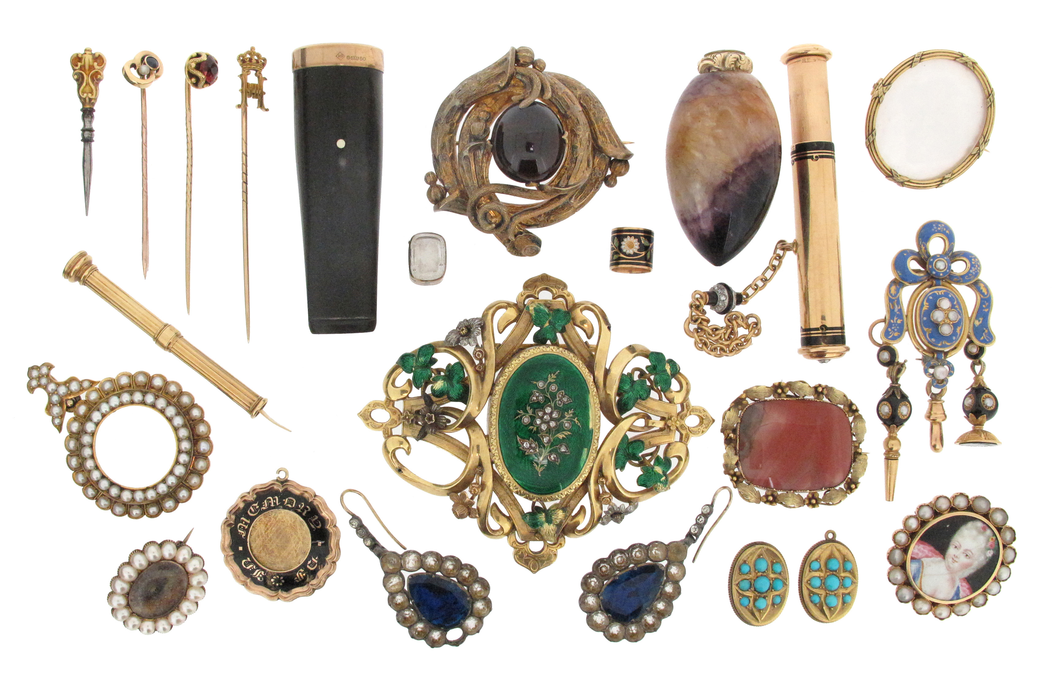 Various items of jewellery etc, including a French 18ct gold cylindrical container with black enamel decoration and both terminals set with a rose-cut diamond, a large gold scroll brooch with diamond-set green enamel foliate decoration, a French gold tied fluted frame containing an oval section of shell, a gold circular pendant with two rows of seed pearls and vacant centre, a gold chatelaine top with blue enamel decoration suspending a small gold fob seal and a small gold watch key, both with seed pearl and black enamel decoration, a gold retracting tooth pick with bloodstone terminal and signed S Mordan & Co, three assorted gold stick pins, a gold foliate brooch mounted with an oval-shaped cabochon garnet, a 9ct gold mounted cigar holder by Alfred Dunhill, a miniature gold box mounted with two hardstones, a pair of blue and white paste drop earrings (cased) and nine other items