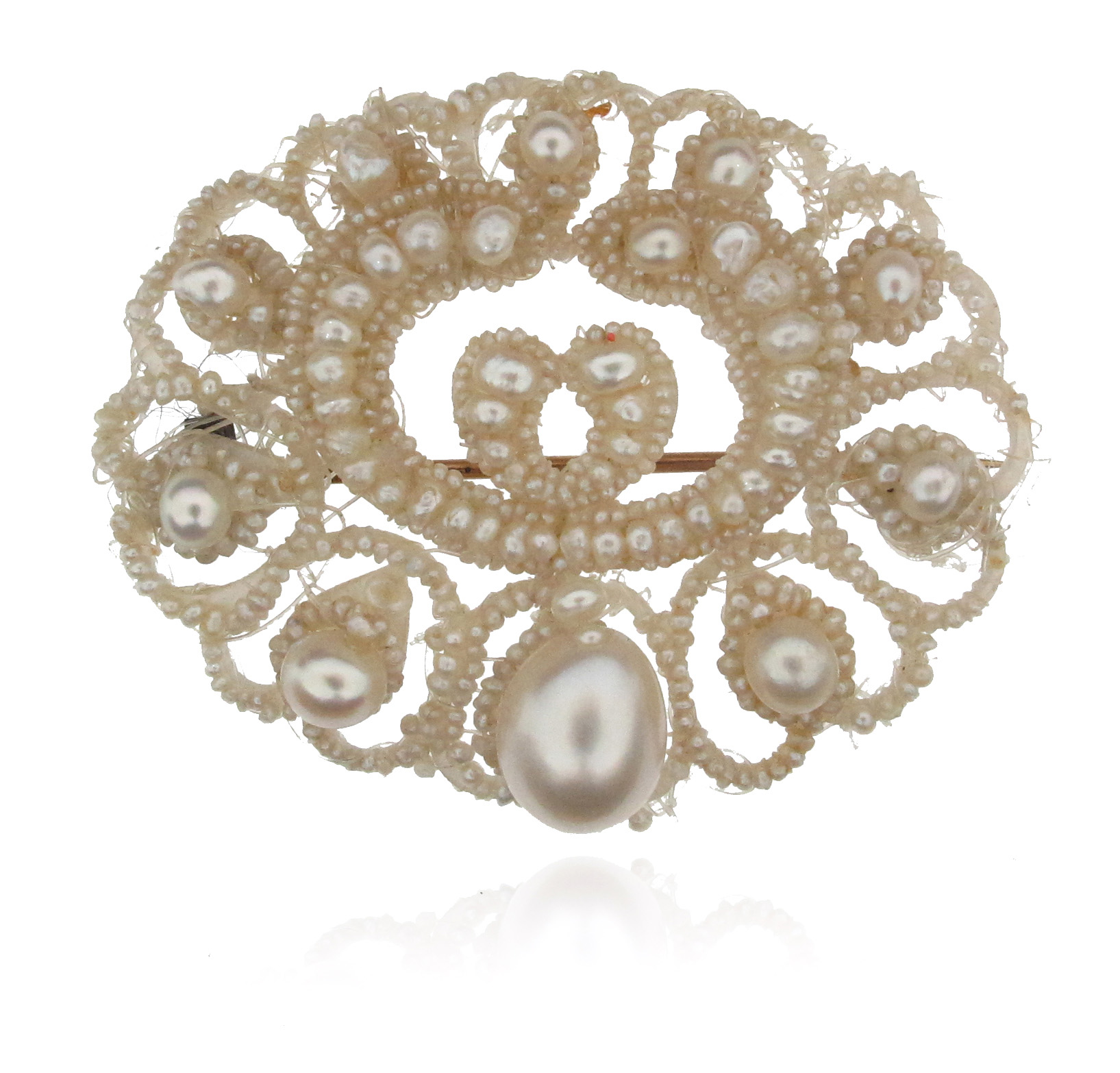A George III pearl-mounted open work brooch, set on mother-of-pearl and suspending a larger oval-shaped drilled pearl