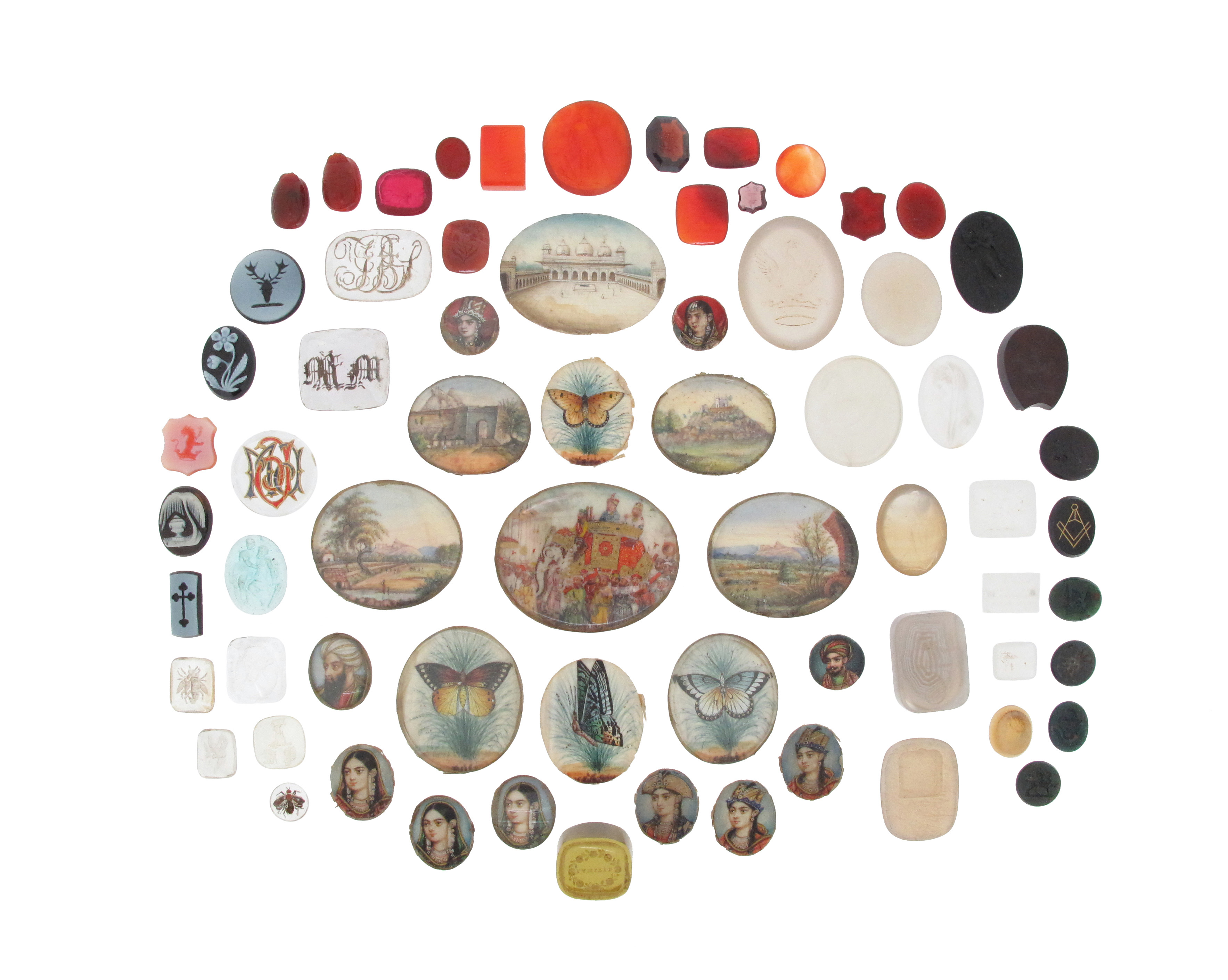 Forty-seven assorted intaglios and cameos etc, including a carved hardstone intaglio carved with heads in the classical manner, a carved hardstone intaglio depicting Hope, two bees and two carved scarabs, together with a collection of miniature paintings, probably Indian and painted on ivory, including five landscapes and groups, four butterflies, the interior of a palatial building and ten portraits