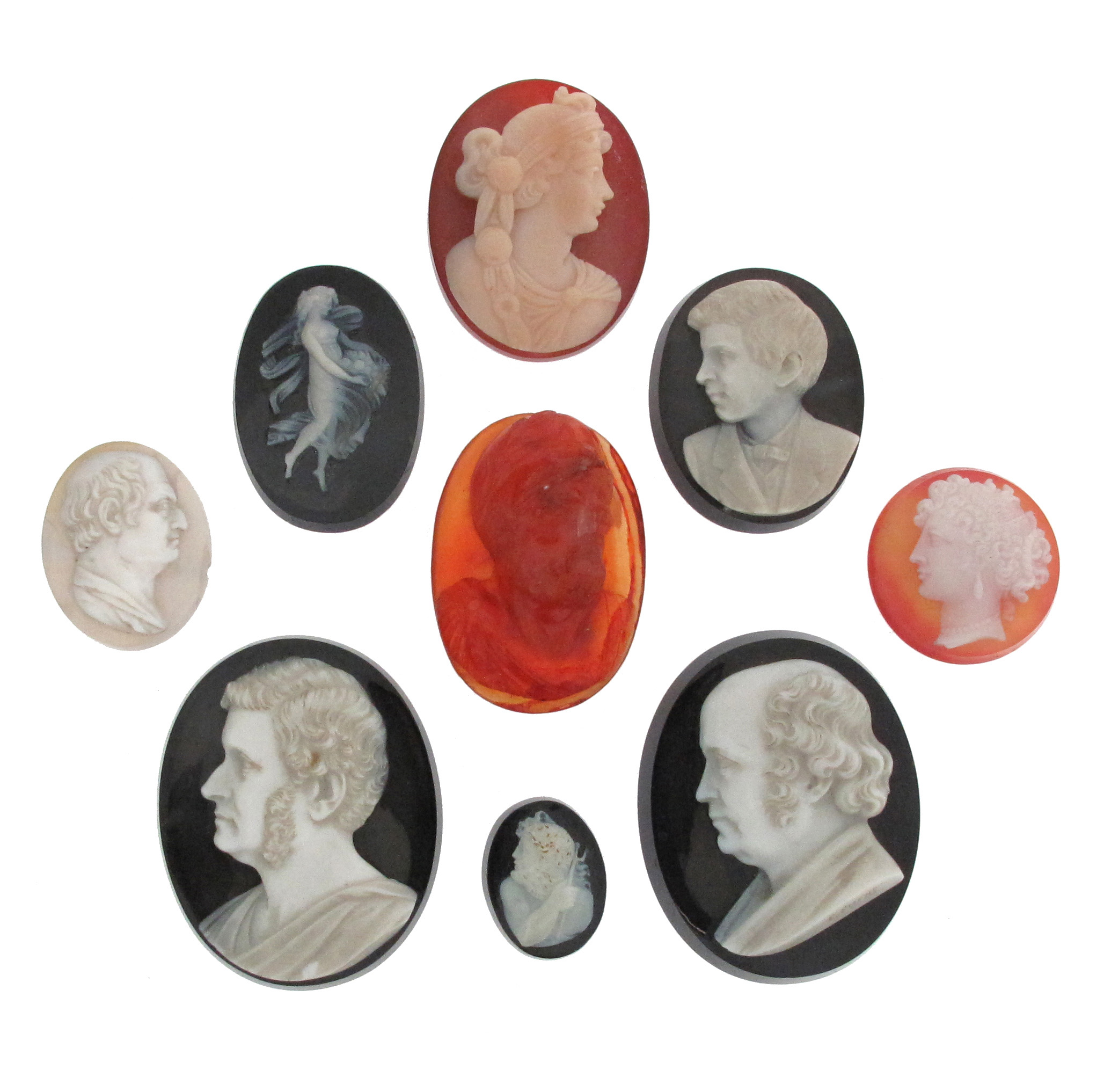 Nine assorted carved hardstone portrait cameos, the largest 4.5cm high, the smallest 2cm high