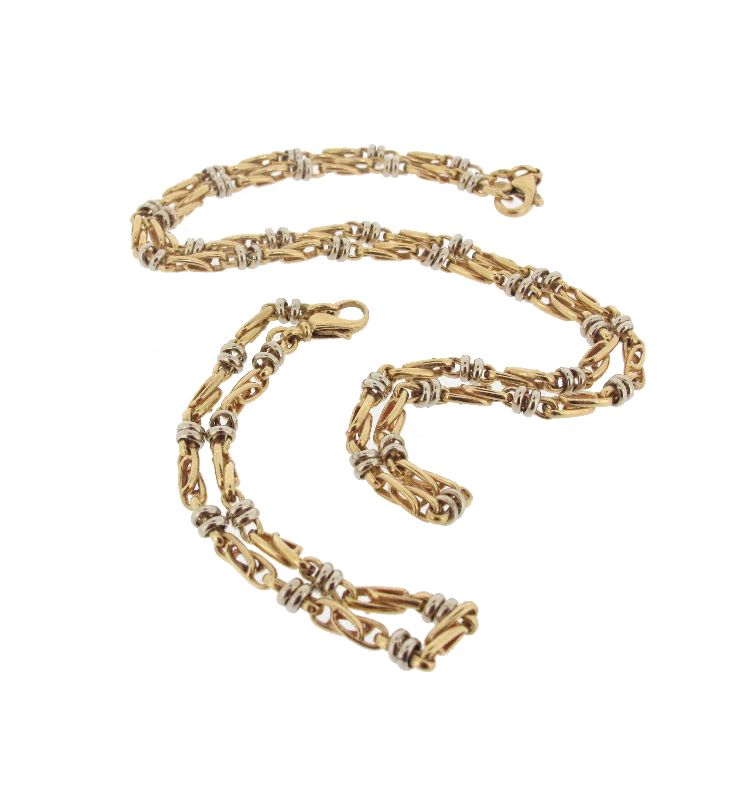 An Italian two-colour gold fancy-link necklace and matching bracelet, necklace 46cm long, bracelet 16cm long