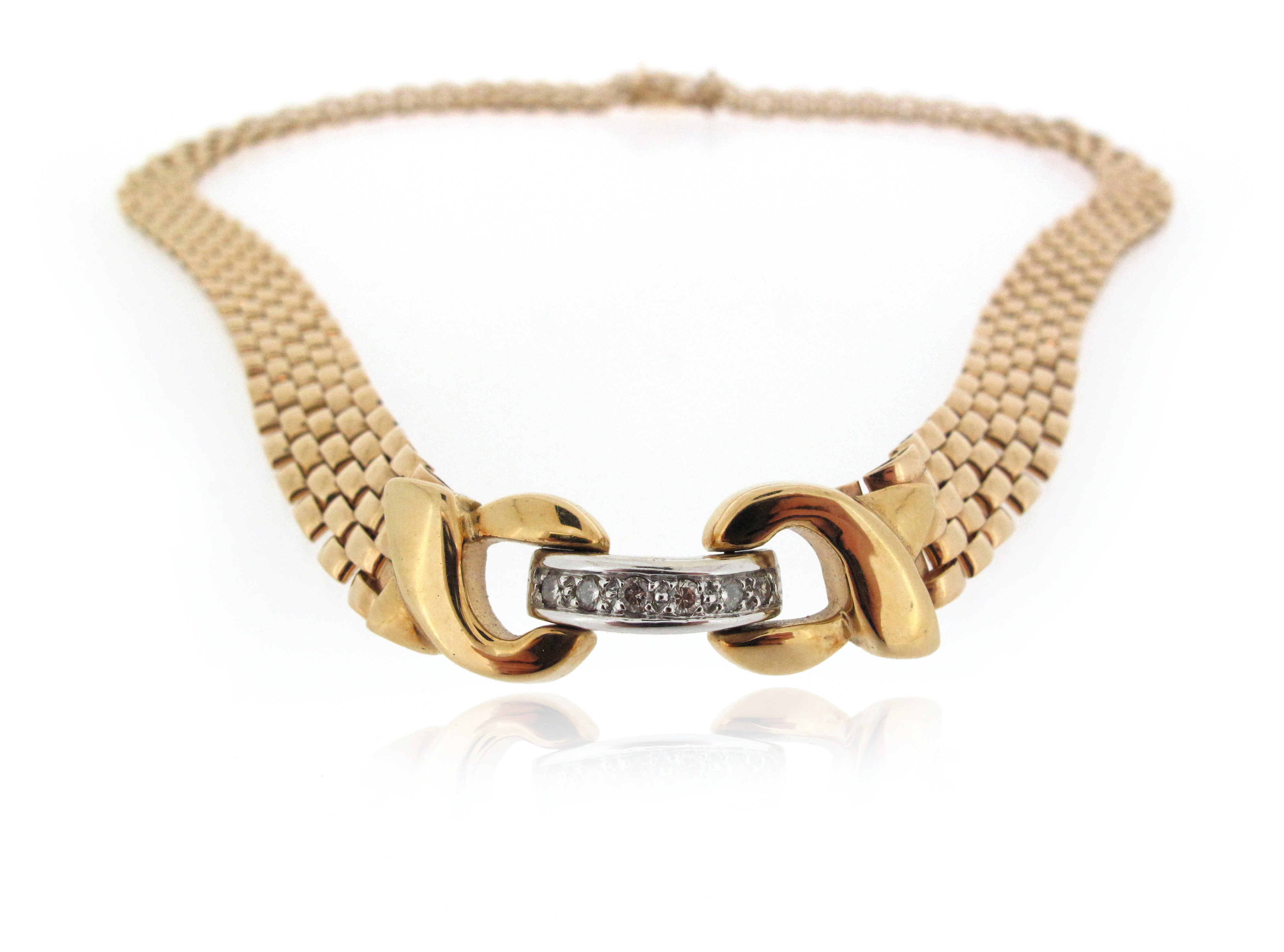 An Italian brick-link collar necklace, the central section set with round brilliant-cut diamonds in yellow and white gold, 42cm long