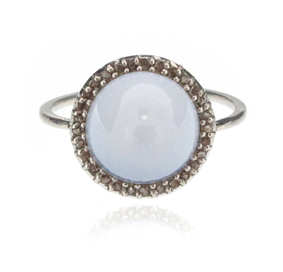 A sugarloaf-shaped chalcedony ring, set within a surround of rose-cut diamonds in white gold, size K