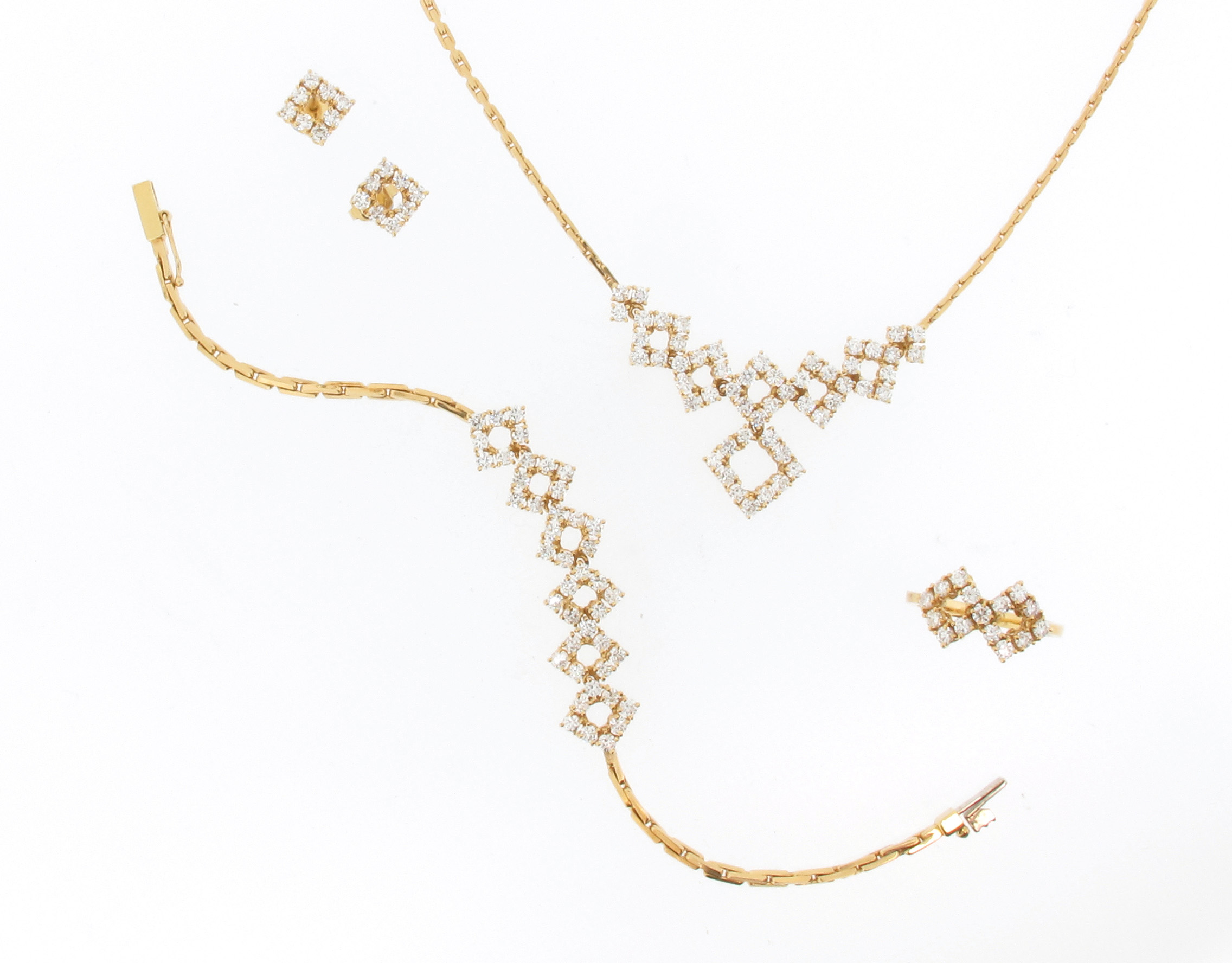 A suite of diamond-set gold jewellery, comprising a necklace, bracelet, a ring and earrings, each mounted with diamond-set lozenges in yellow gold, 32g total, the ring size O, the necklace 41cm, fitted case