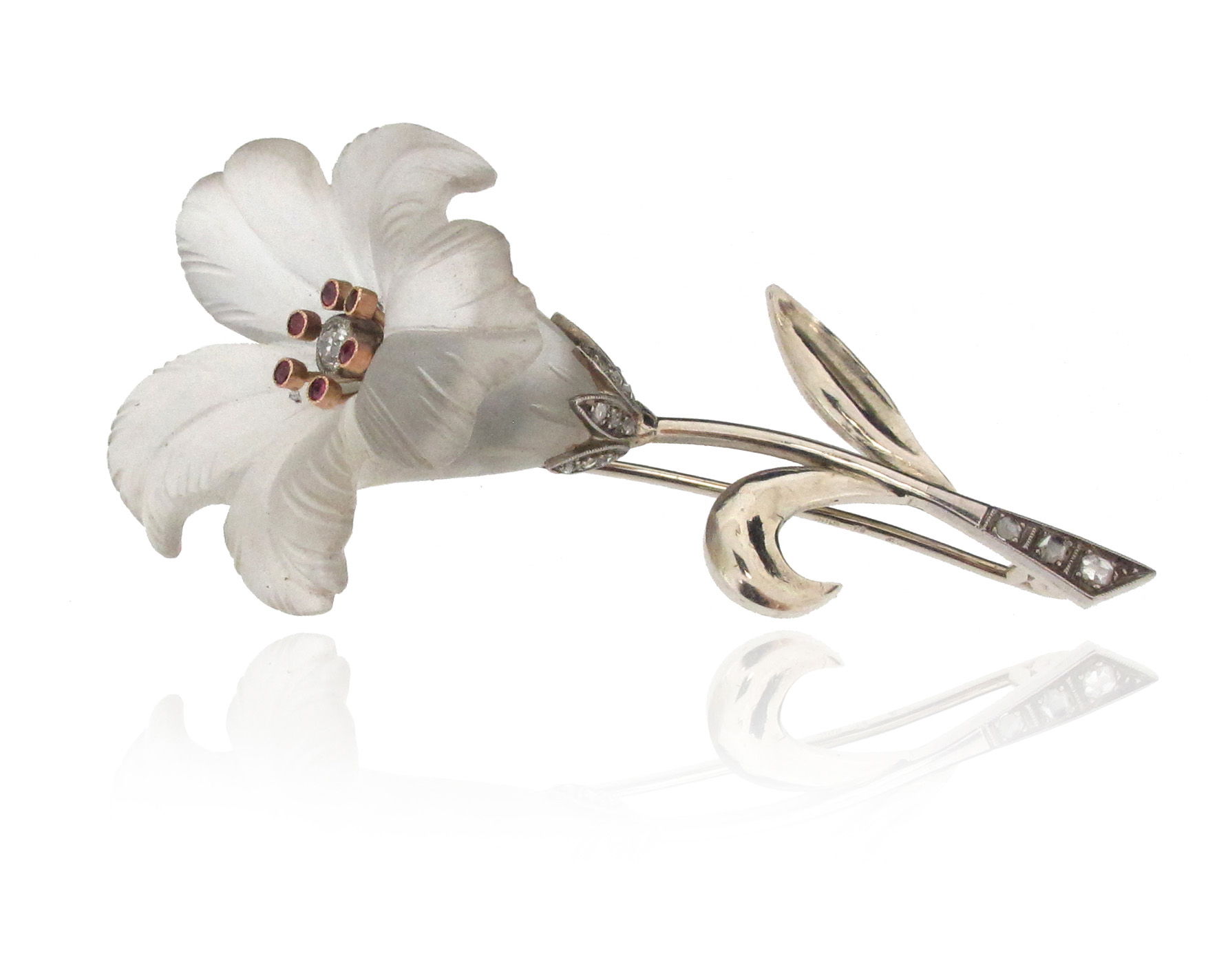 A carved crystal foliate brooch, centred with a diamond within a surround of of six rubies and mounted in white gold with diamond-set stem, 6.5cm long