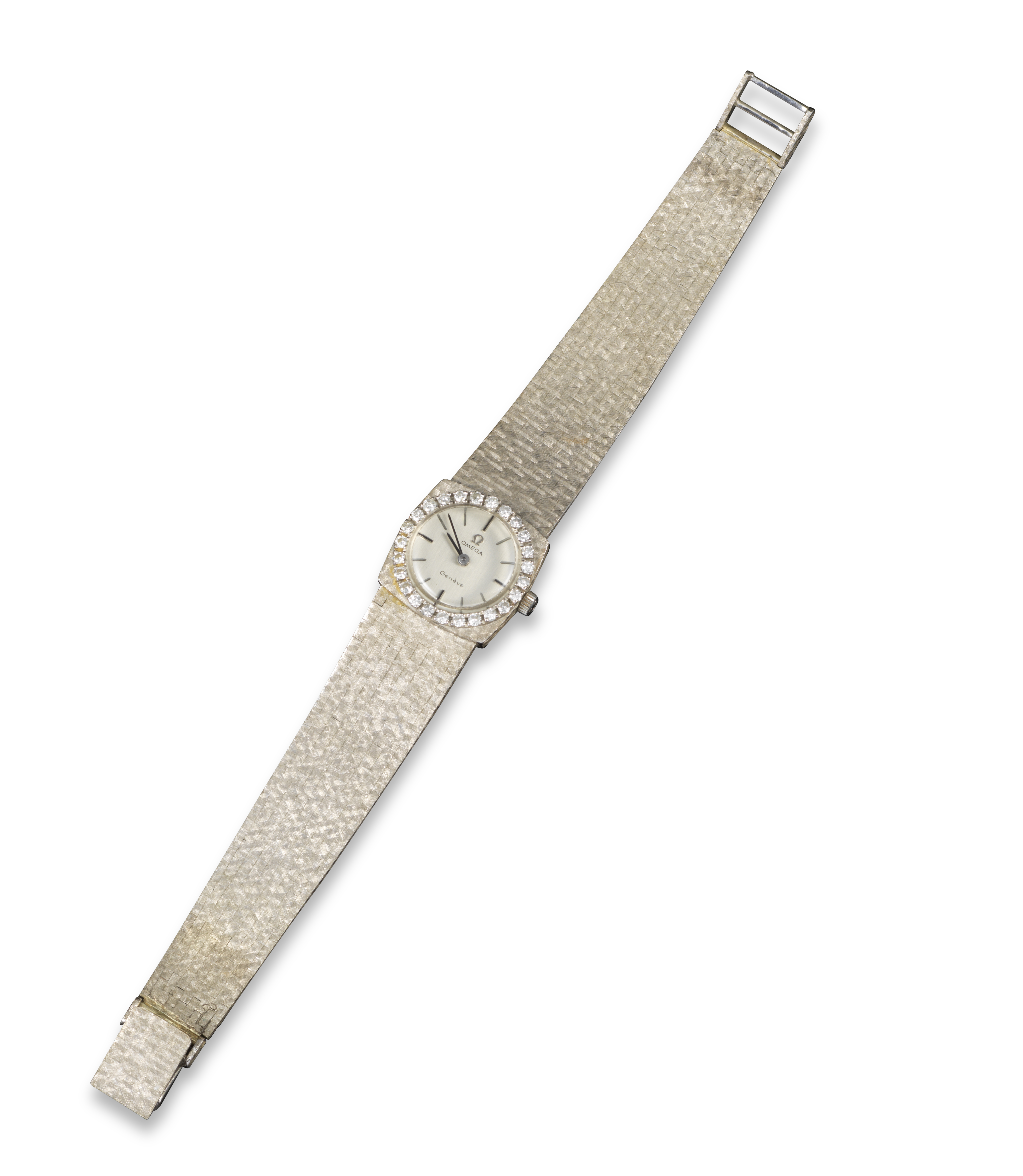 A lady's diamond-set Omega wristwatch, the signed dial with baton numerals, circular-cut diamonds to the bezel on 18ct white gold brick-link band, 2.2cm wide (including winder) 17cm long, case
