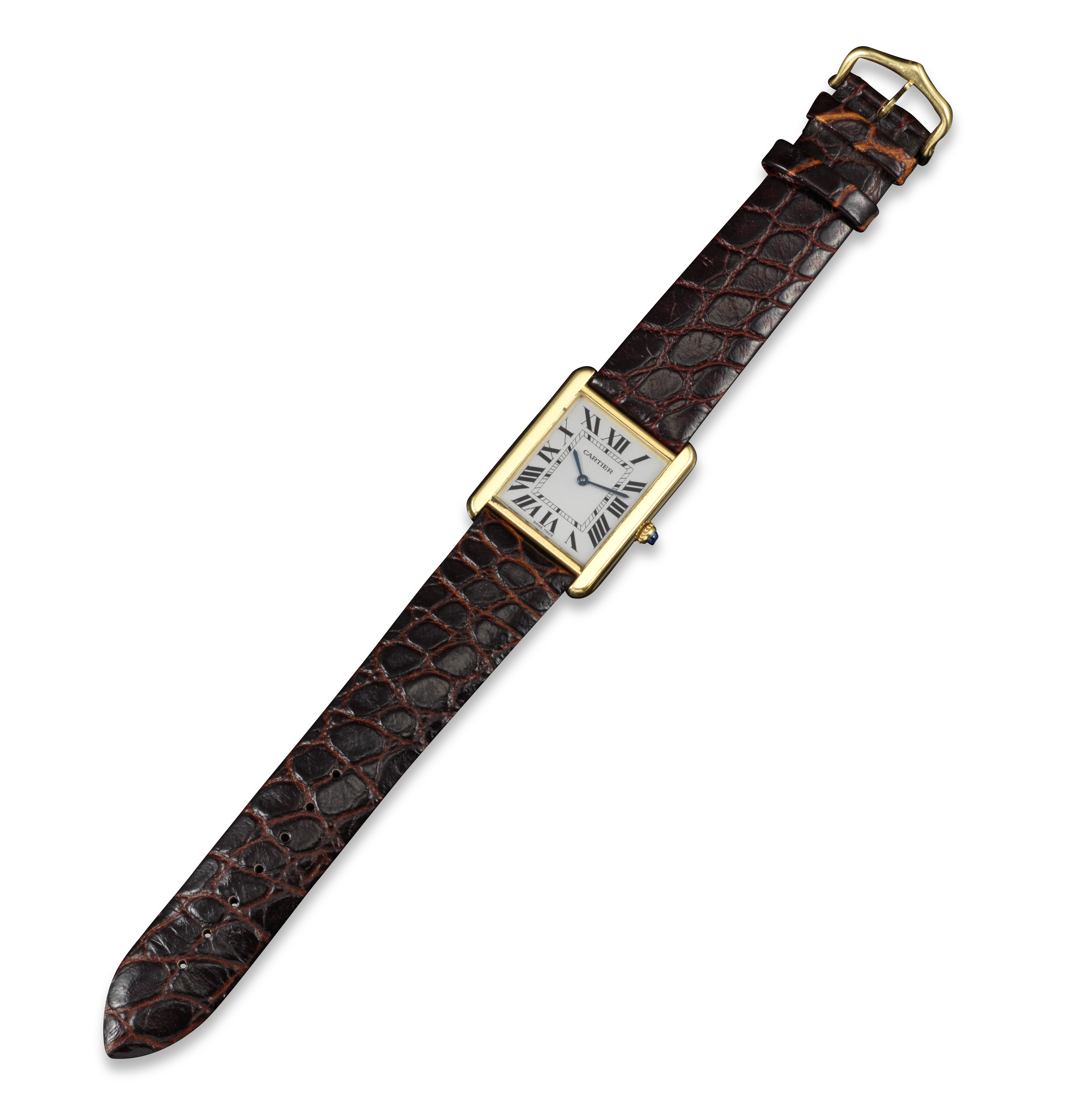 A gold tank wristwatch by Cartier, sapphire winder, steel-back,` quartz movement and leather band, 3.4cm high, 2.5cm wide