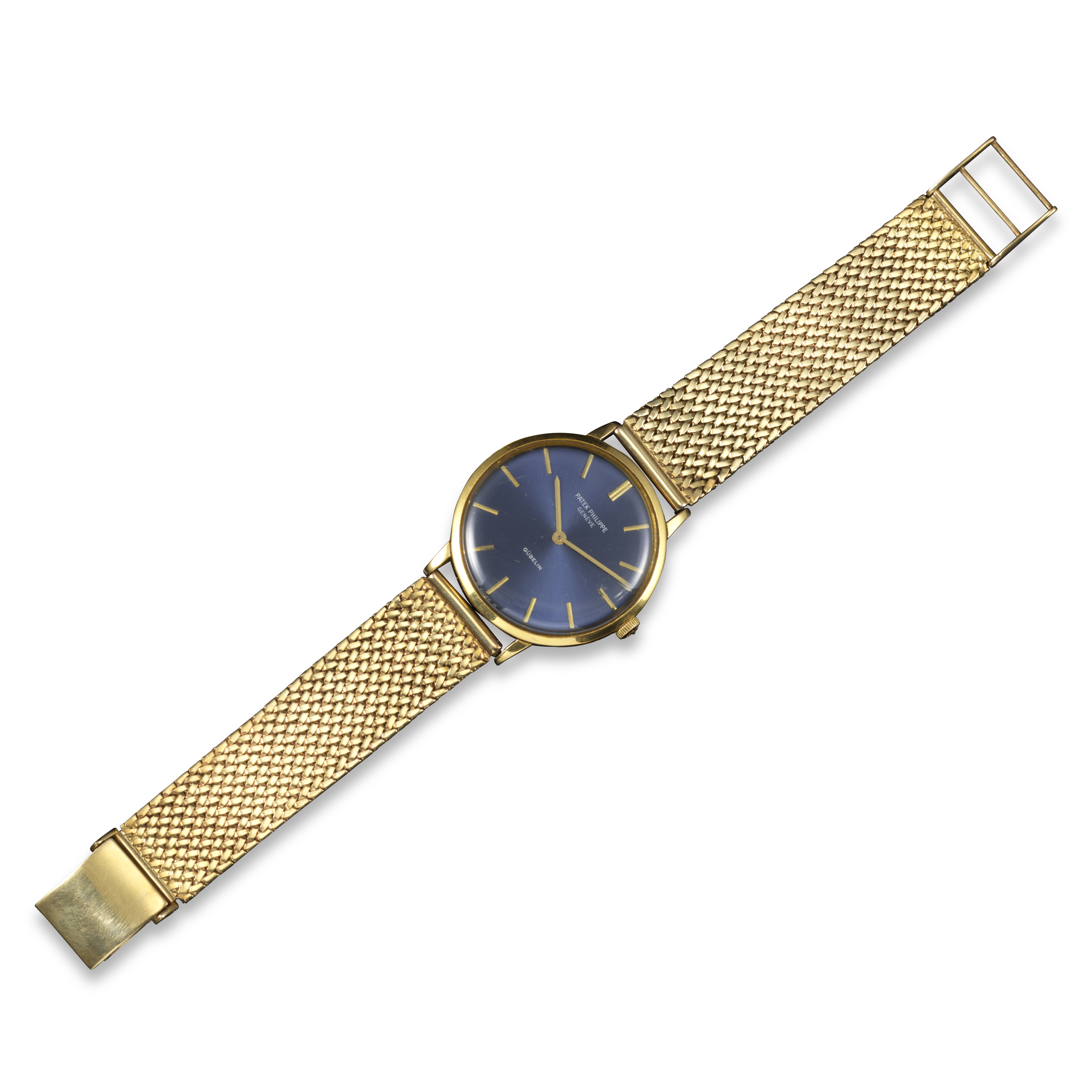 A gentleman's Patek Philippe gold Calatrava wristwatch, the signed blue dial with baton numerals, manual movement, movement number 1220236, reference number 3468, case 3.5cm wide including winder, on an 9ct gold mesh band, in Patek Philippe case and paperwork from 1973