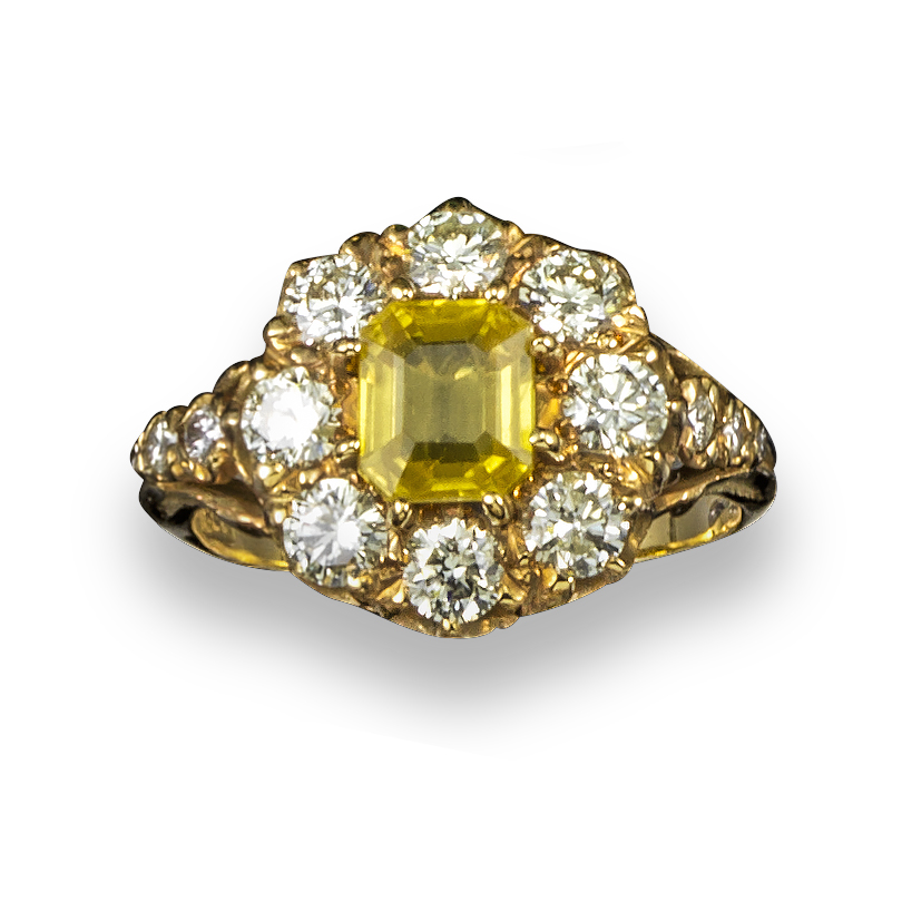 A yellow sapphire and diamond cluster ring