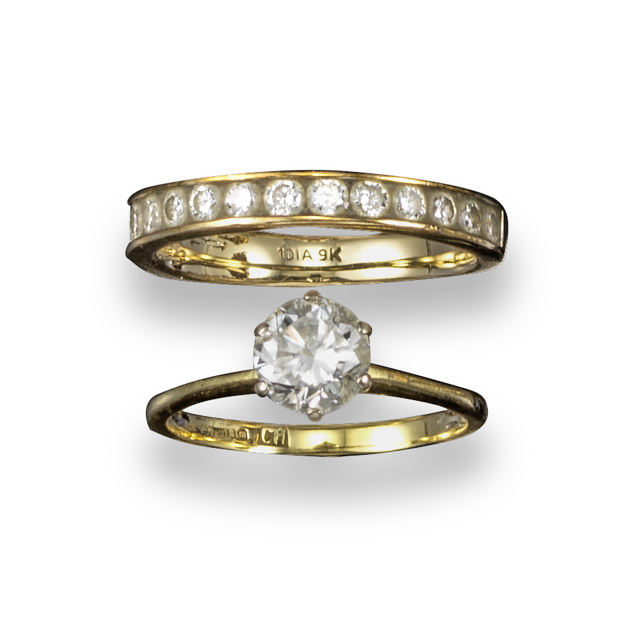 A diamond solitaire ring, the round brilliant-cut diamond weighs approximately 0.70cts, set in platinum and yellow gold, size K, with a diamond half hoop ring, the circular-cut diamonds channel-set in yellow gold, size J 1/2