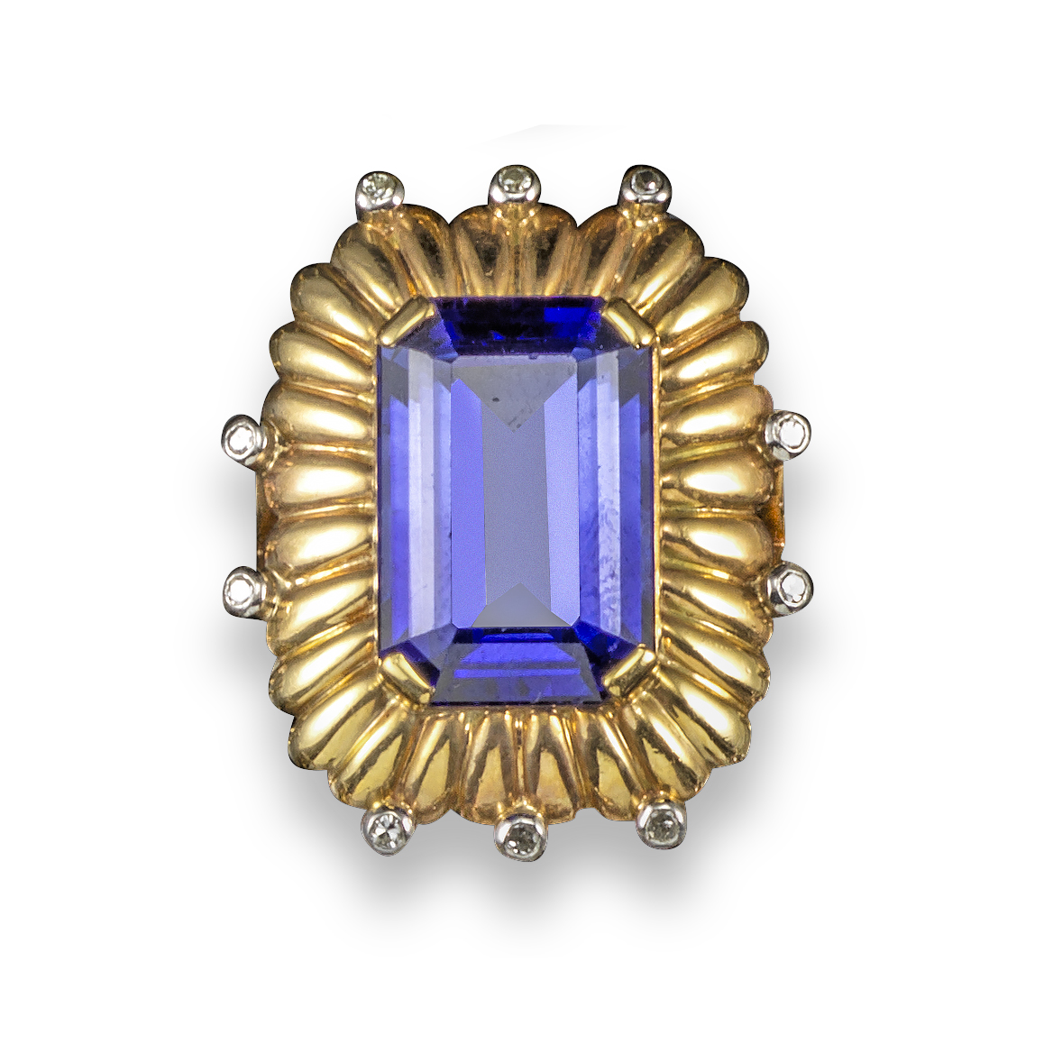 A synthetic sapphire and diamond ring, the emerald-cut synthetic sapphire is set within fluted yellow gold surround set with diamonds, size P