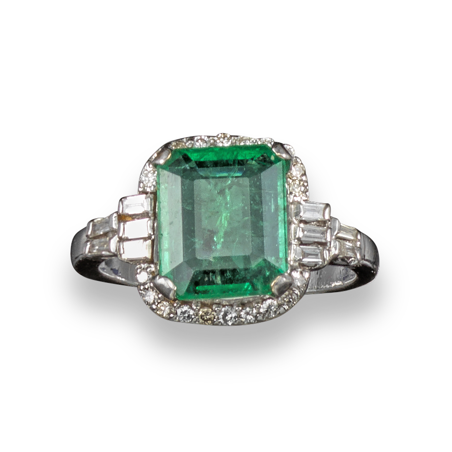 An emerald and diamond cluster ring, the emerald-cut emerald is set within a surround of baguette-shaped and circular-cut diamonds in white gold, size O