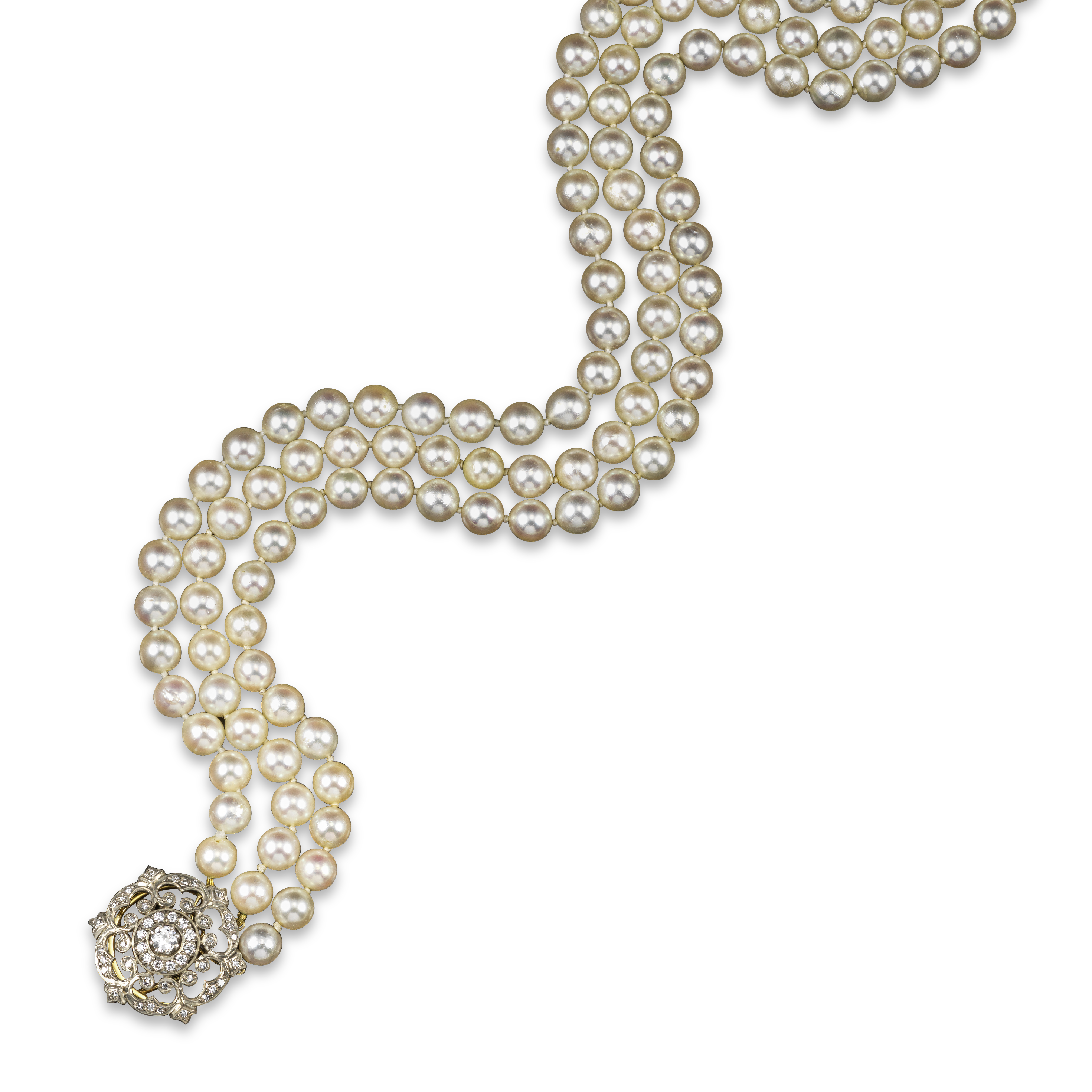 A three row cultured pearl necklace, set with a detachable Victorian diamond cluster clasp in silver and gold, the necklace 41cm longest, clasp 2.8cm wide