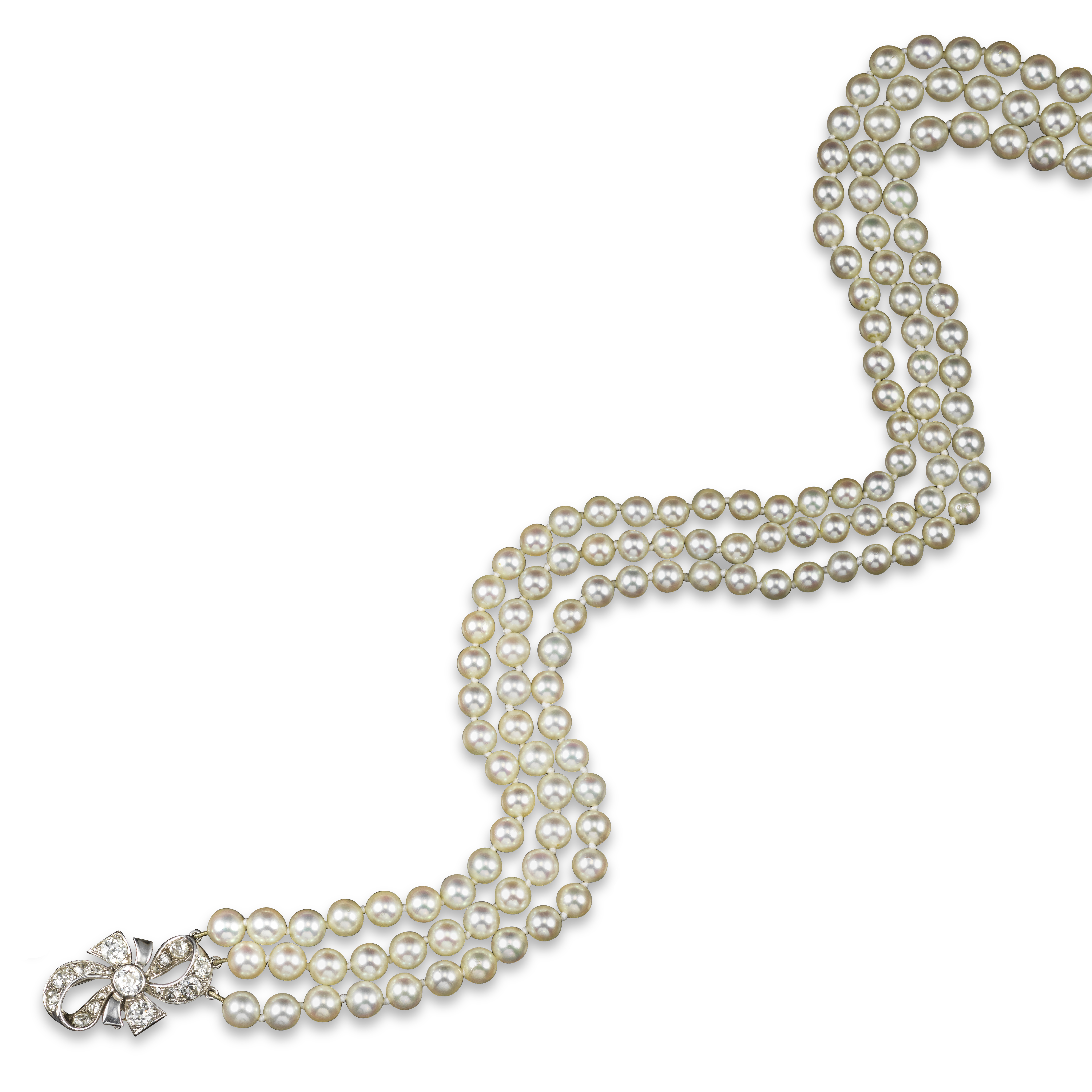 A cultured pearl and diamond necklace, the three-row cultured pearl necklace with diamond set bow clasp in platinum, necklace 56cm longest