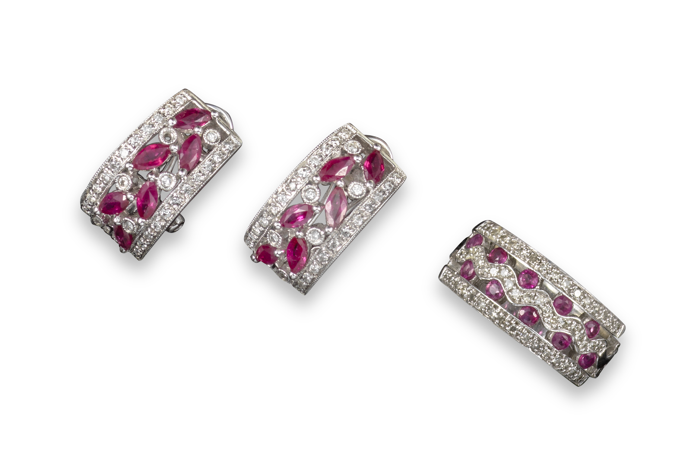 A pair of ruby and diamond earrings, set with marquise-shaped rubies and circular-cut diamonds within diamond border in white gold, post and clip fittings, 18mm high, with a matching ruby and diamond ring set in white gold, maker RJM, size O 1/2